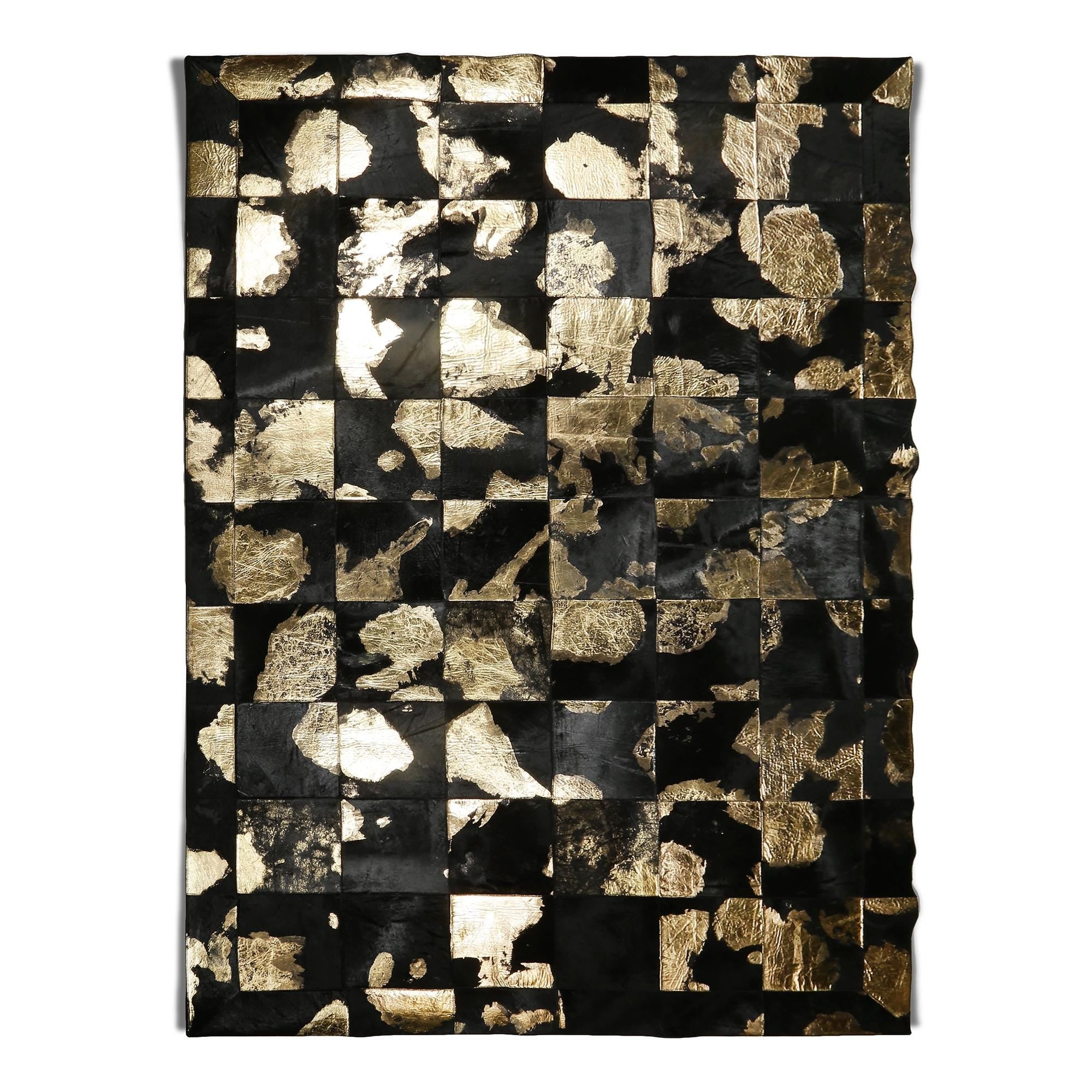 Siyah & altın & doğal tonlara sahip bu dana derisi halı, doğal dokusu ve şık görünümüyle dikkat çeker.