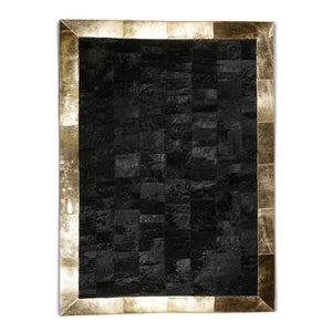 Siyah & altın tonlara sahip bu dana derisi halı, doğal dokusu ve şık görünümüyle dikkat çeker.
