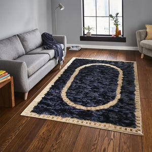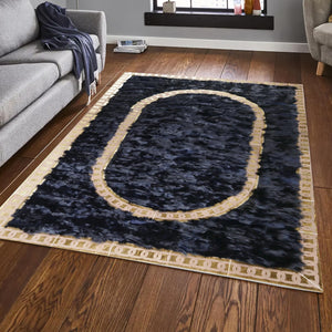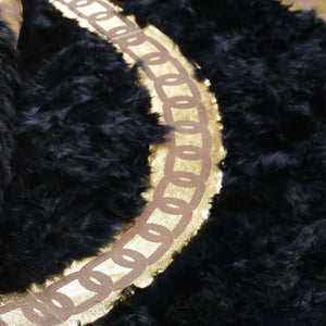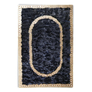 Lacivert zemin üzerine altın oval desen ve bordür detaylarıyla tasarlanan bu Toskana derisi halı, doğal yapısı ve el işçiliğiyle öne çıkar. Zarif ve lüks bir görünüm sunar.