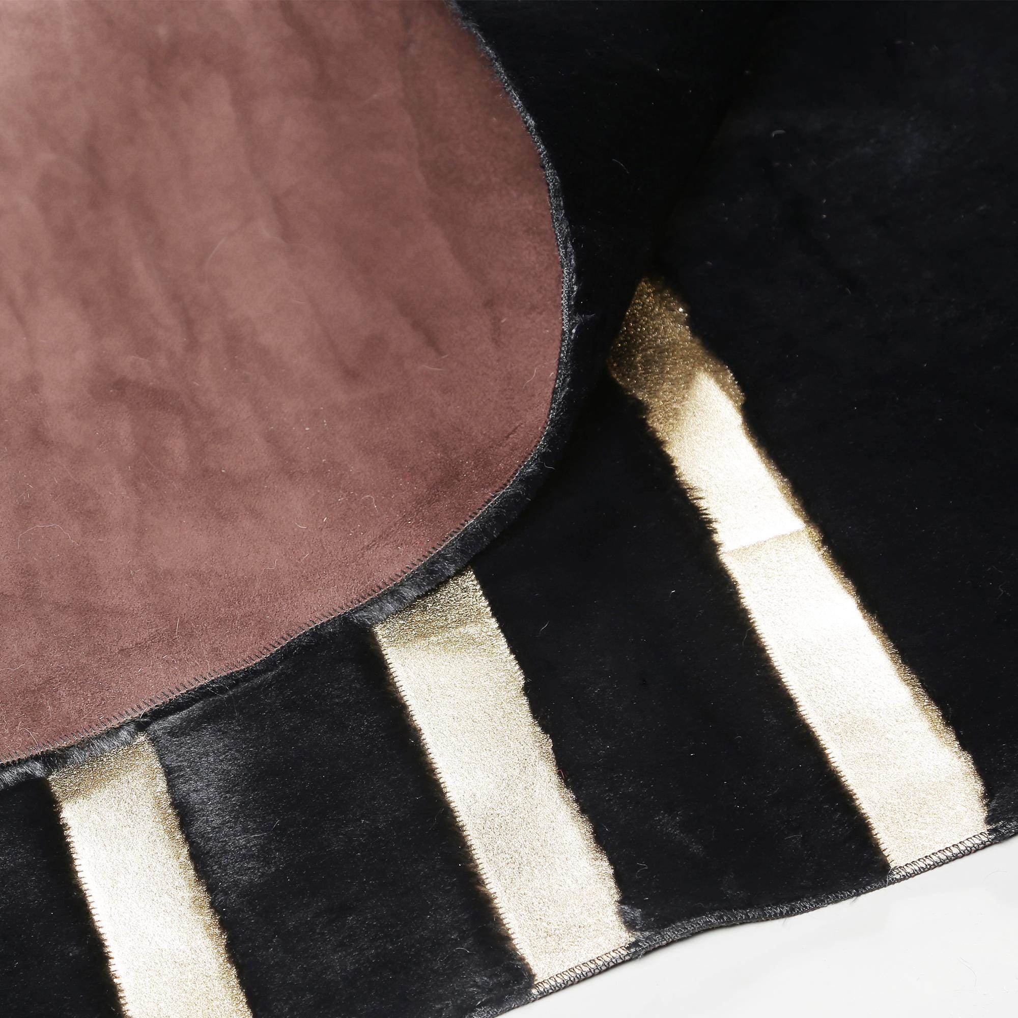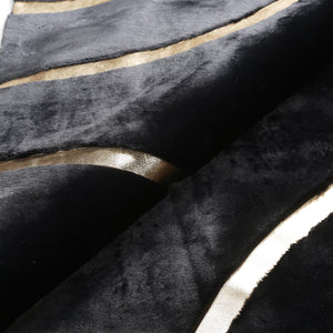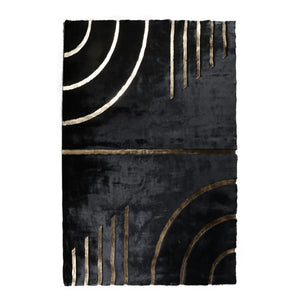 Bu siyah zemin üzerine altın detaylı peluş halı, modern geometrik çizgileriyle dikkat çeker. Yumuşak dokusu ve dayanıklı yapısıyla hem şıklık hem de konfor sağlar.