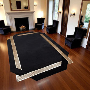 Altın Bordürlü Siyah Peluş Halı – El Yapımı Yumuşak ve Şık Salon Halısı