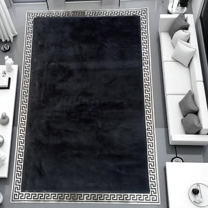 Gümüş Bordürlü Siyah Peluş Halı – El Yapımı Yumuşak ve Şık Salon Halısı