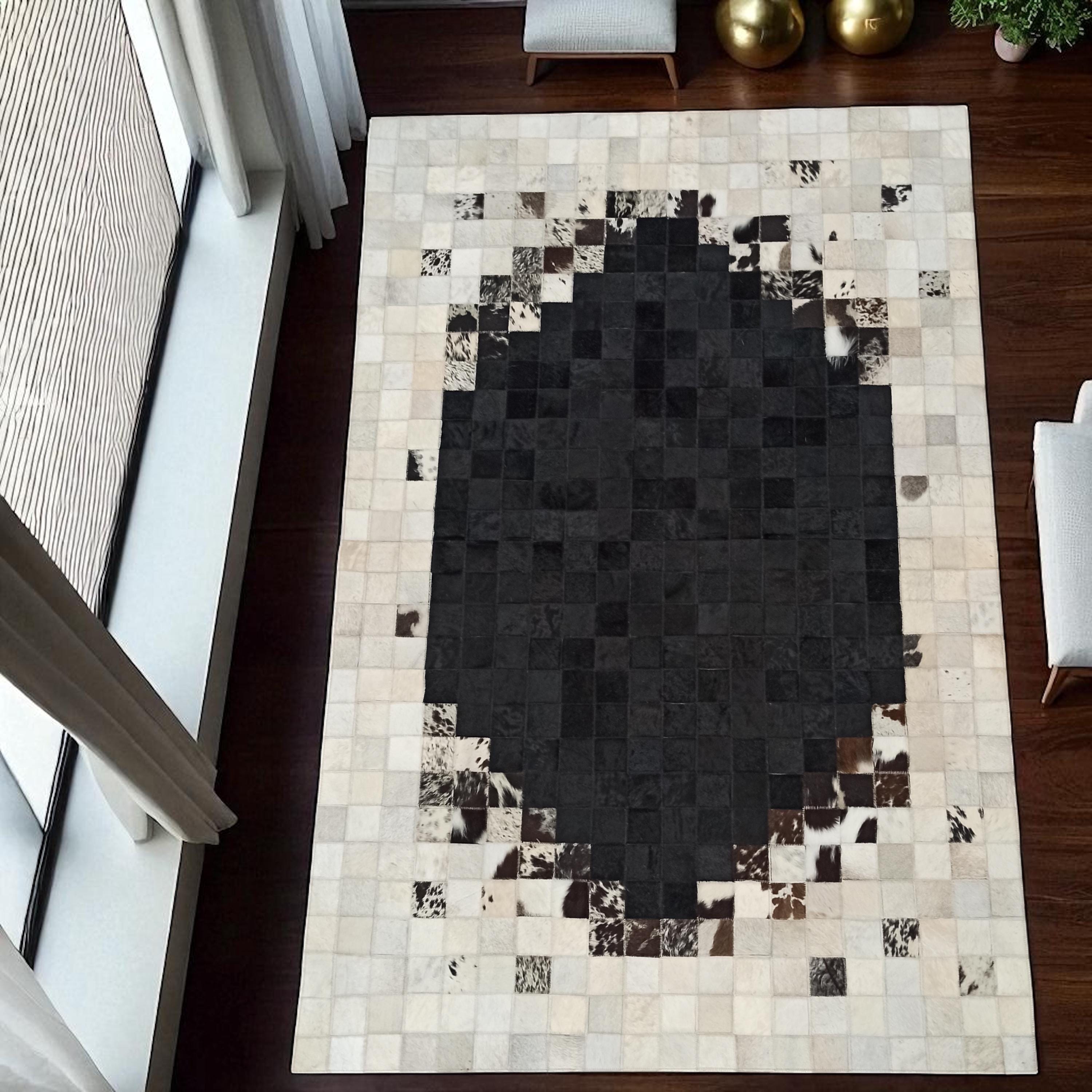 Doğal Dana Derisi Patchwork Halı – Siyah Bej Renkli El Yapımı Modern Ortam Halısı