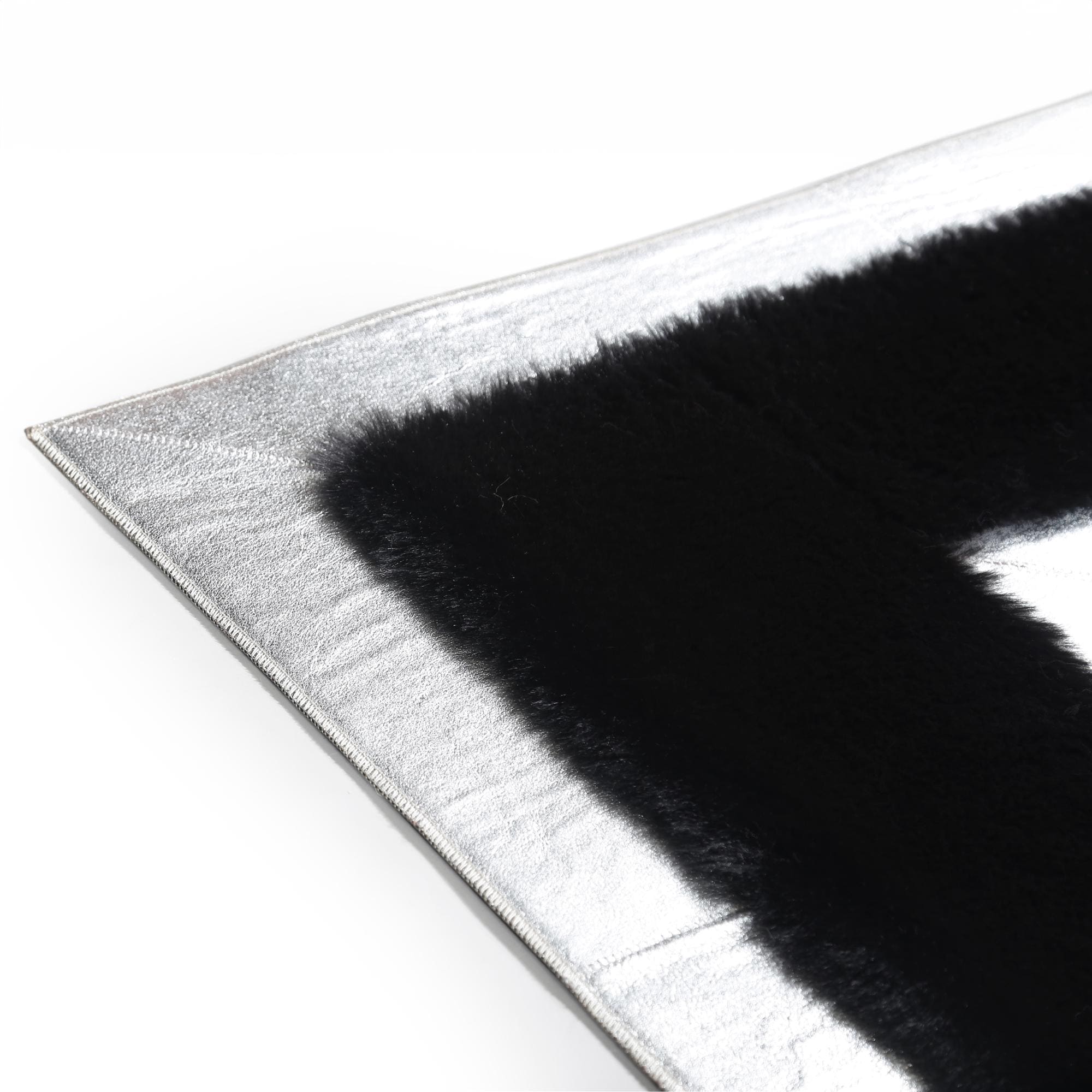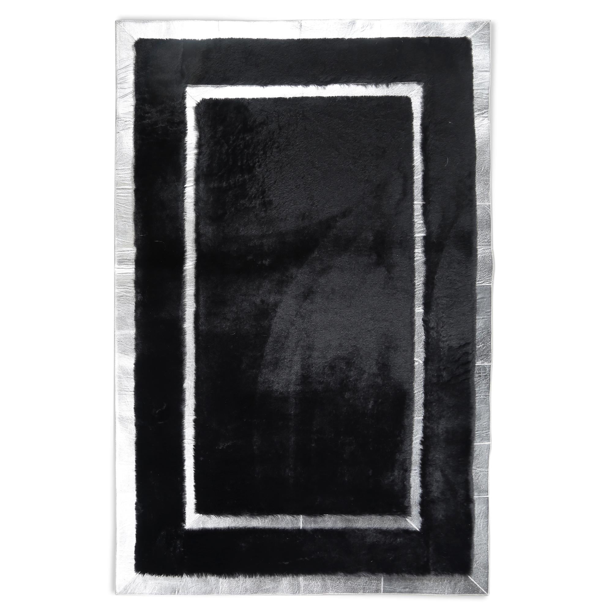 Bu siyah zemin üzerine beyaz çerçeveli peluş halı, modern tasarımıyla şıklık katar. Yumuşak dokusu ve dayanıklı yapısıyla uzun süreli kullanım için idealdir.
