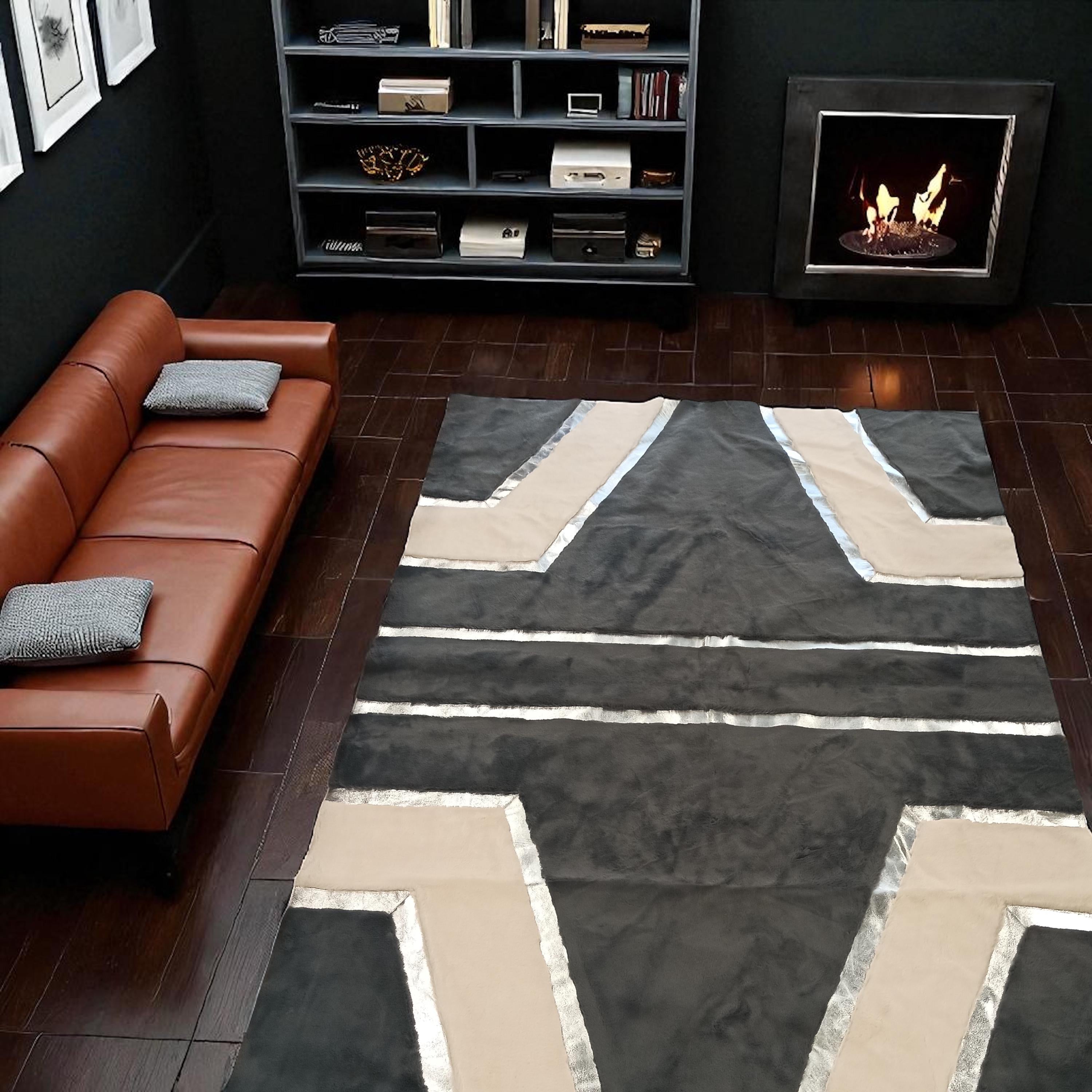 Gri ve Beyaz Modern Desenli Yumuşak Peluş Halı – Şık ve El Yapımı Yumuşak Halı Modeli