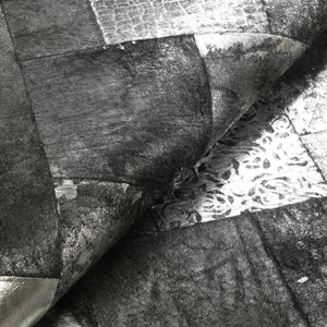 Siyah & gümüş tonlara sahip bu dana derisi halı, doğal dokusu ve şık görünümüyle dikkat çeker.