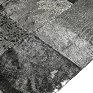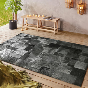 Gri ve Siyah Tonlarında Kare Desenli Patchwork Gerçek Dana Derisi Halı