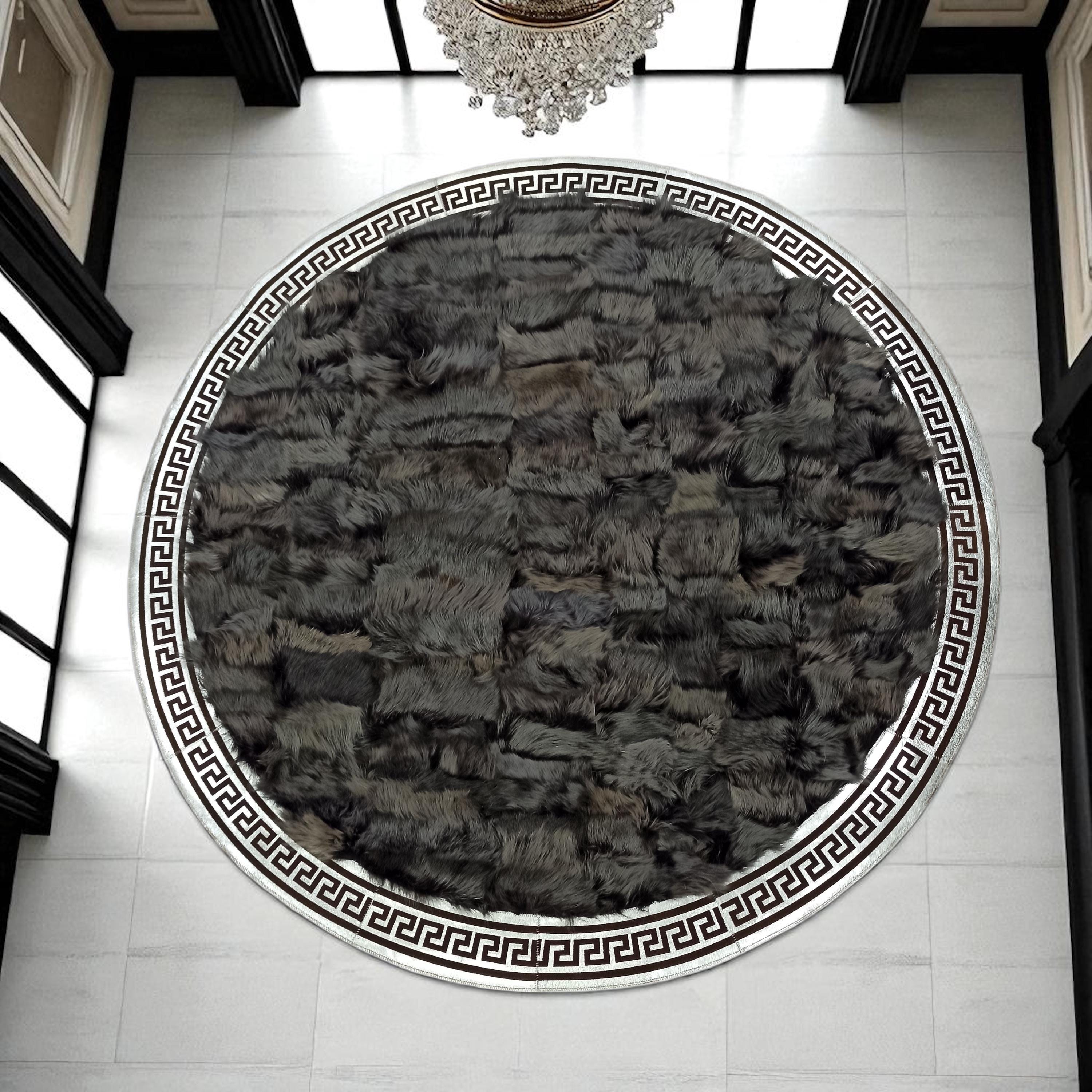 Gümüş Bordürlü Yuvarlak Koyu Kahverengi Toskana Kürkü Halı – El Yapımı Şık ve Yumuşak Salon Halısı