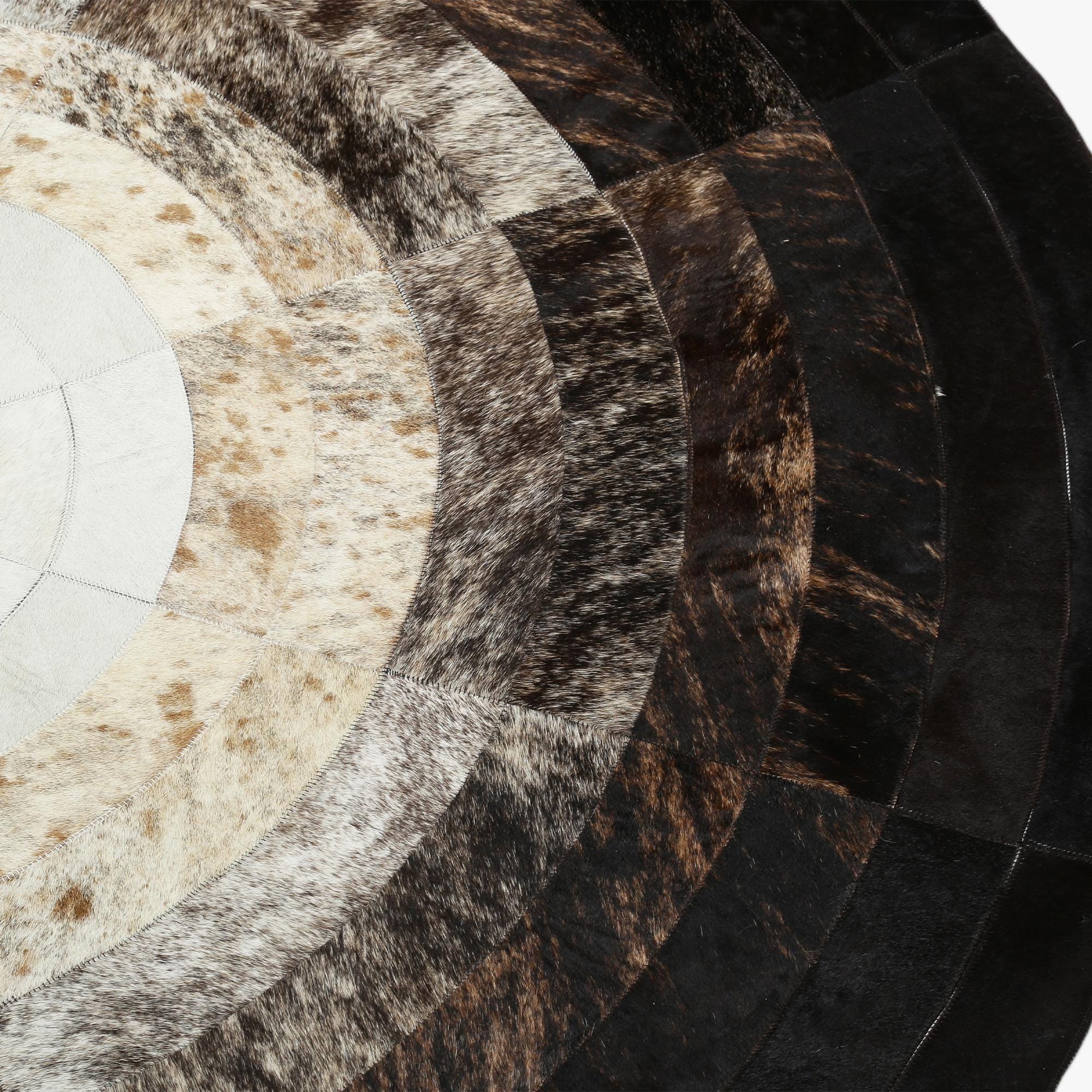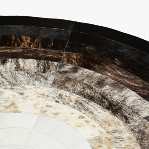 Bu yuvarlak dana derisi halı, el işçiliğiyle hazırlanmış olup doğal yapısıyla dikkat çeker.