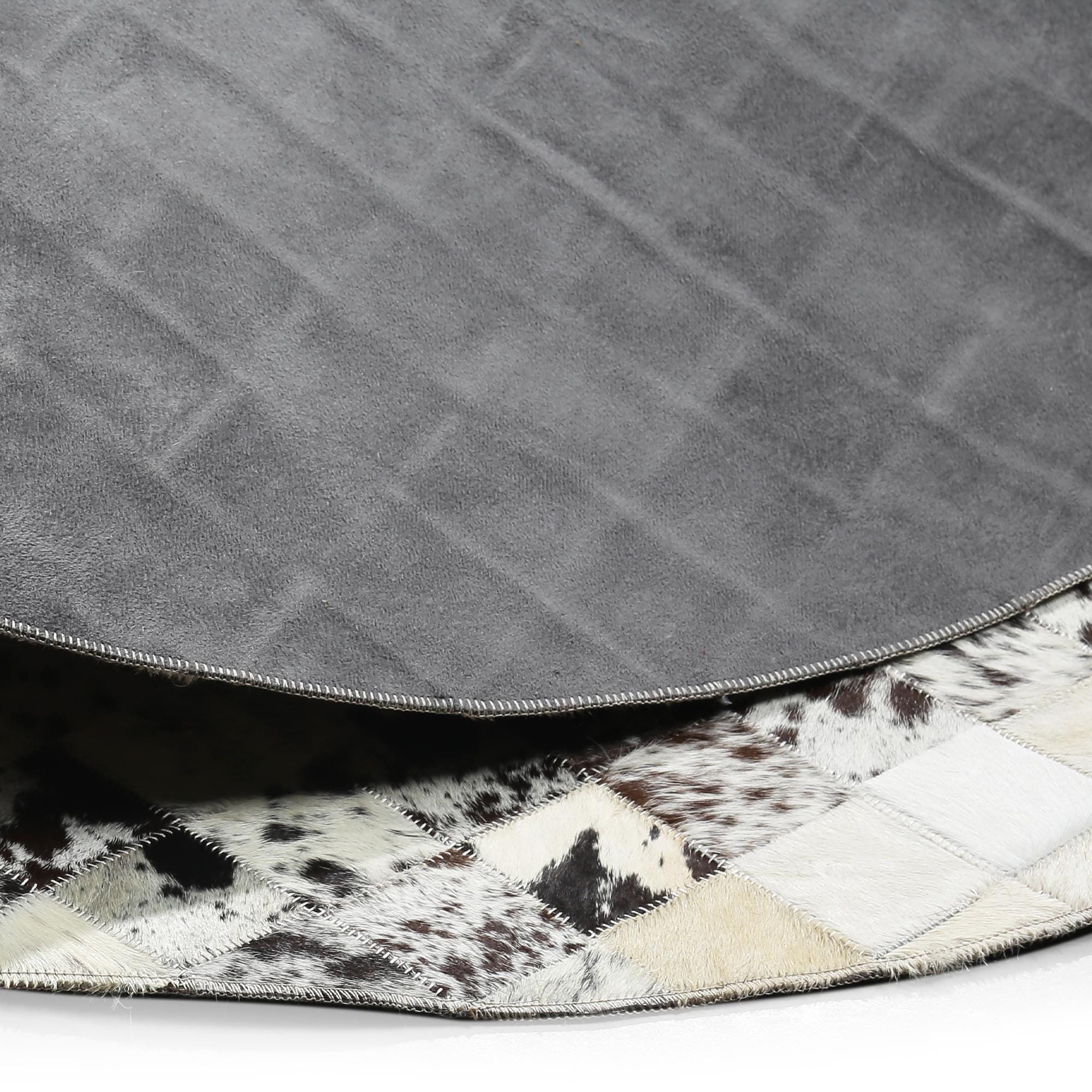 Bu yuvarlak dana derisi halı, el işçiliğiyle hazırlanmış olup doğal yapısıyla dikkat çeker.