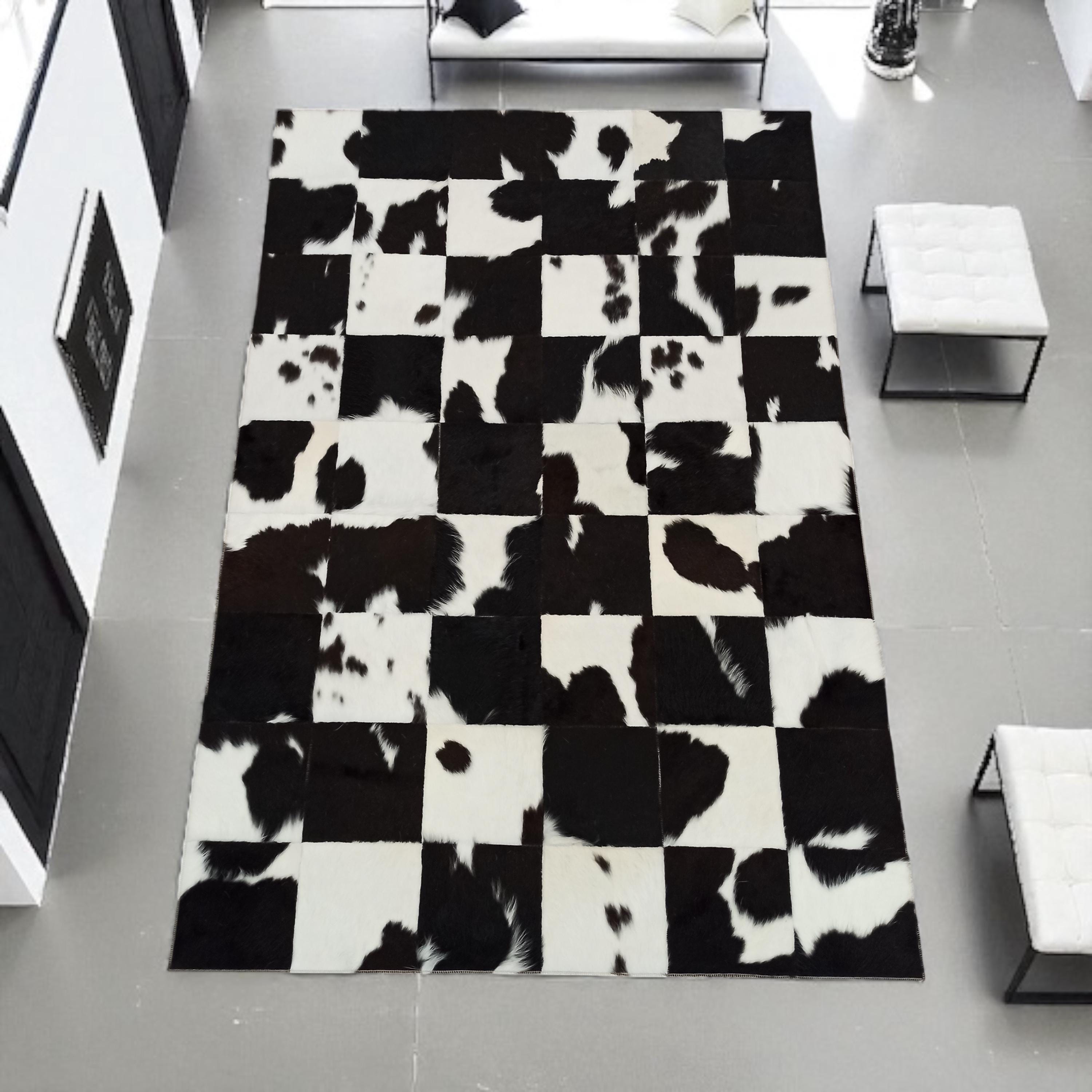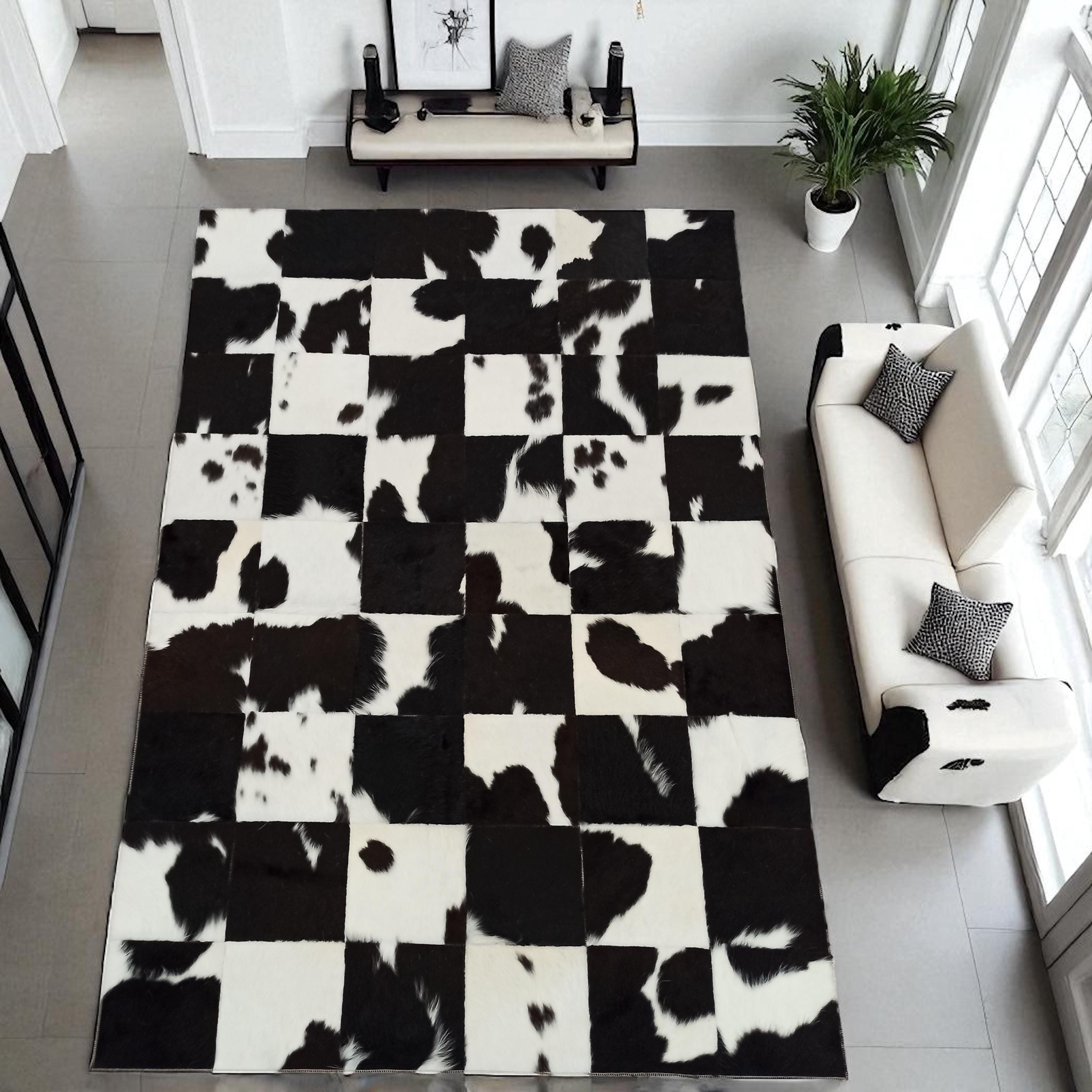 Siyah Beyaz Dana Derisi Patchwork Halı – Dalmaçyalı Desenli El Yapımı Şık Salon Halısı