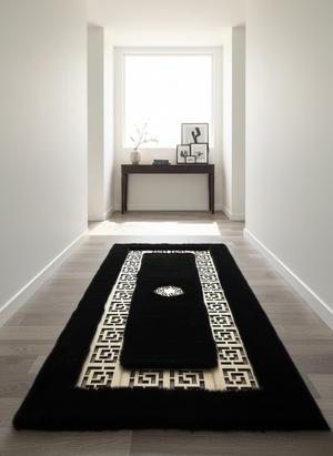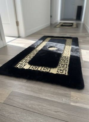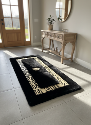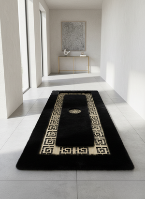 Siyah Peluş Halı - Altın Desenli, İz Yapmayan Yumuşak Doku ve Kaymaz Taban - Özel Ölçü Seçenekleri