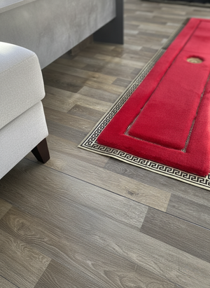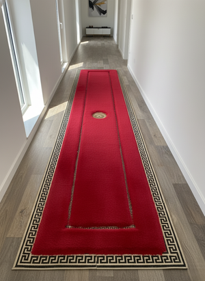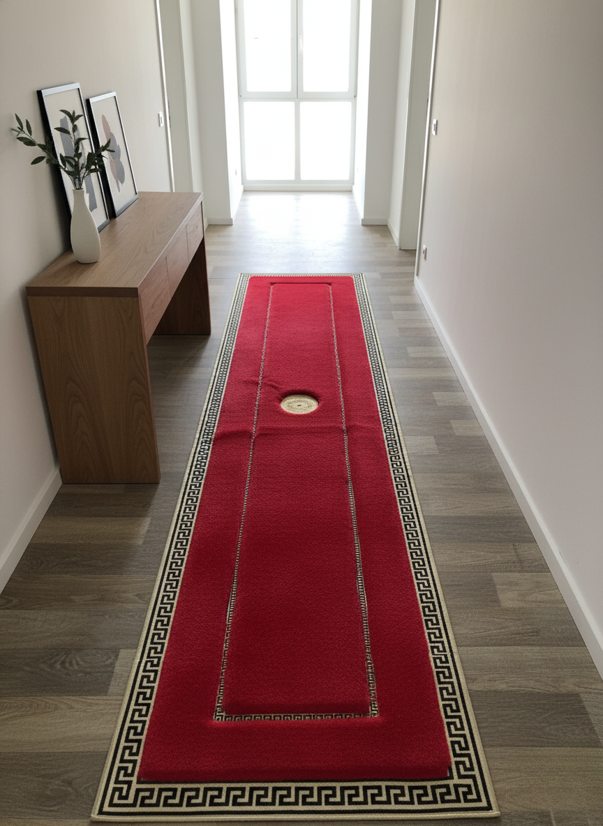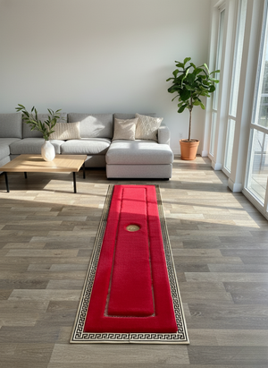 Kırmızı Peluş Antre Halısı – Altın-Siyah Desenli, İz Yapmayan Ultra Yumuşak Doku, Kaymaz Taban – Özel Ölçü Seçenekleri