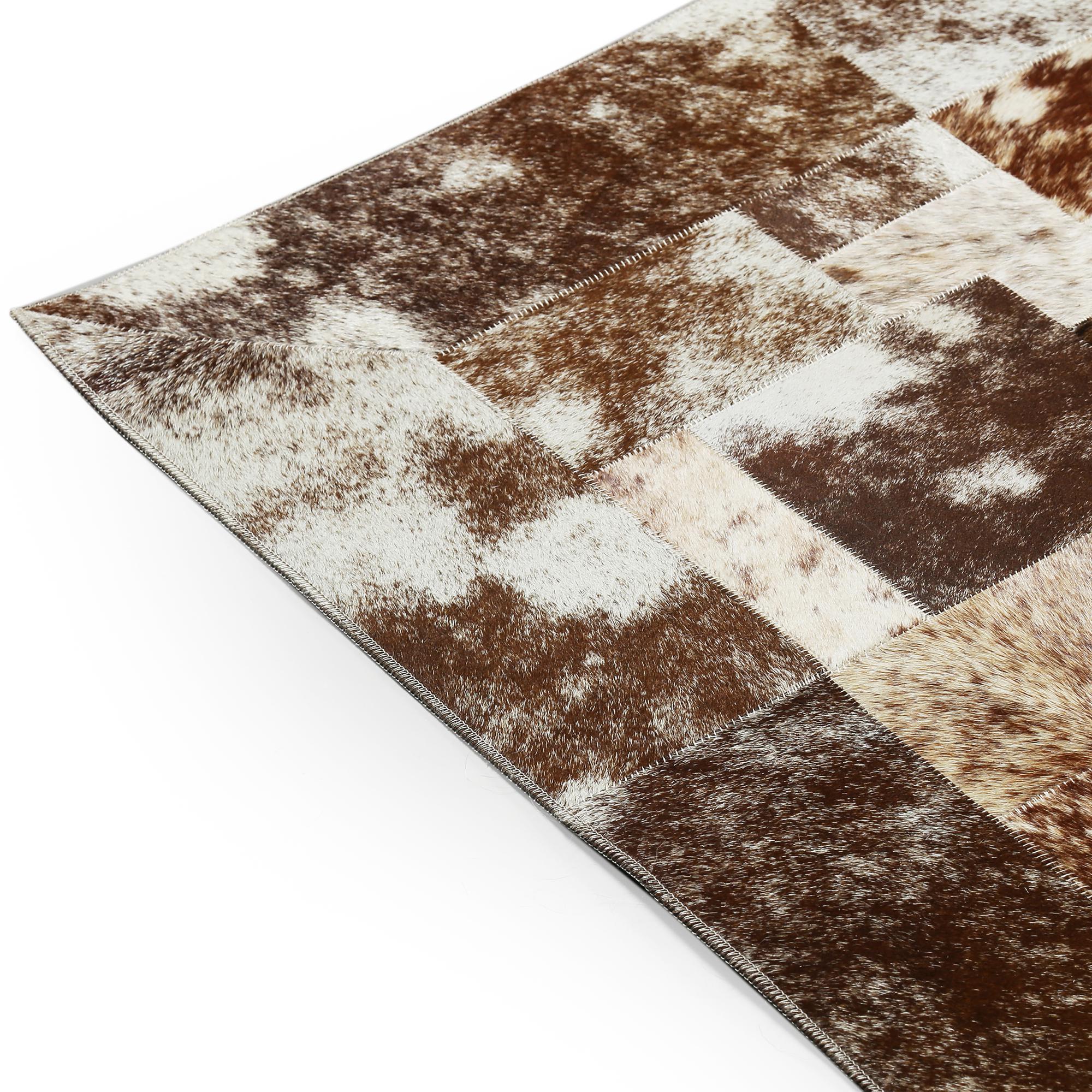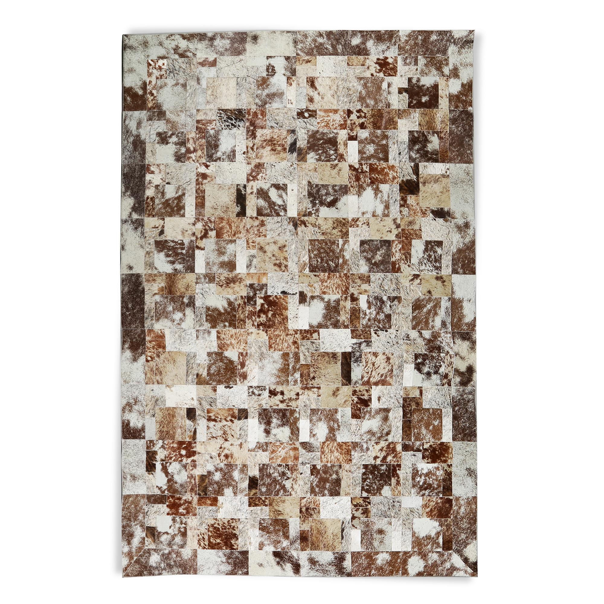 Kahverengi & bej & doğal tonlara sahip bu dana derisi halı, doğal dokusu ve şık görünümüyle dikkat çeker.