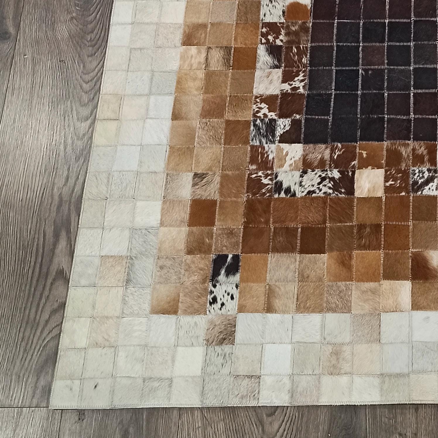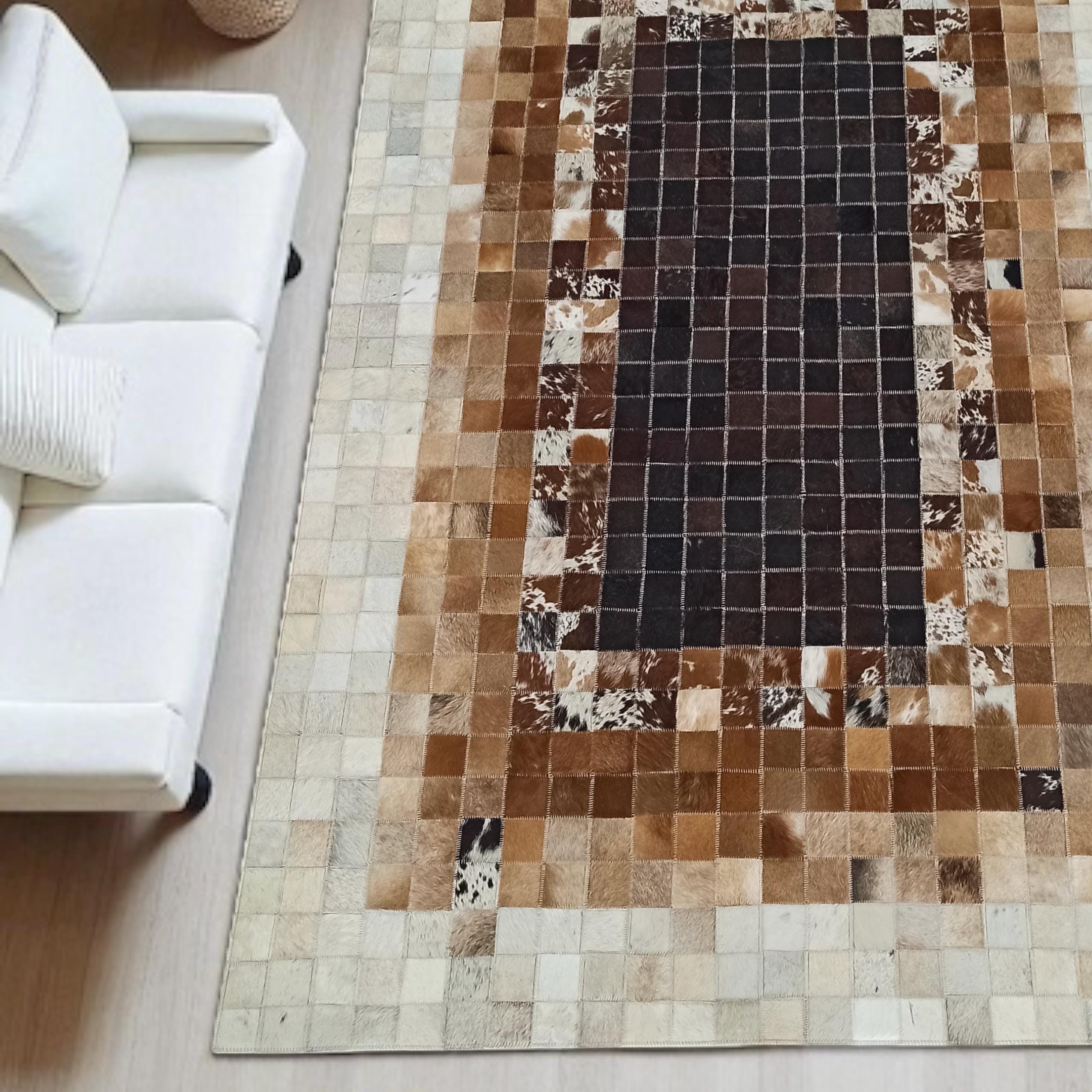 Bej Kahverengi Patchwork Halı – El Yapımı Doğal Dana Derisi Modern Salon Halısı