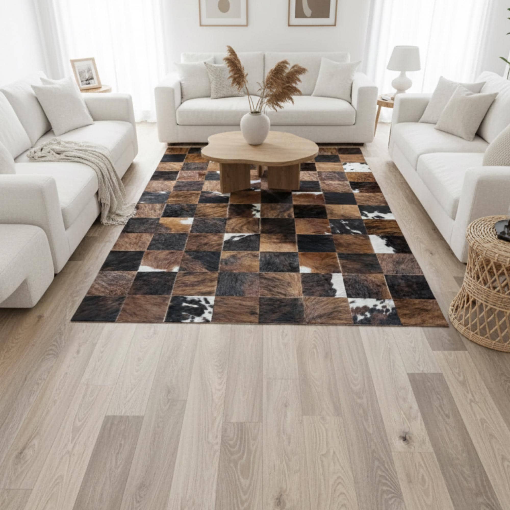Kahverengi, siyah ve açık doğal tonların dengeli dağılımıyla tasarlanan dana derisi patchwork halı, büyük kareli düzeniyle güçlü ve net bir yüzey görünümü sunar. Gerçek dana derisinden üretilen bu halı, doğal dokusu ve sıcak renk geçişleriyle mekâna karakter katar.