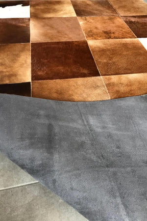 Beyaz & kahverengi & doğal tonlara sahip bu dana derisi halı, doğal dokusu ve şık görünümüyle dikkat çeker.