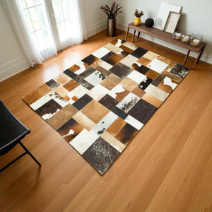 Kahverengi Beyaz Patchwork Halı – El Yapımı Dana Derisi Modern Ortam Halıs