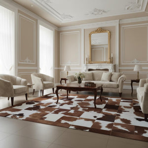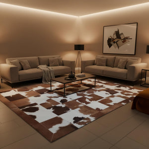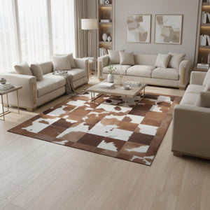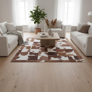 Kahverengi ve Beyaz Tonlu Dana Derisi Patchwork Halı