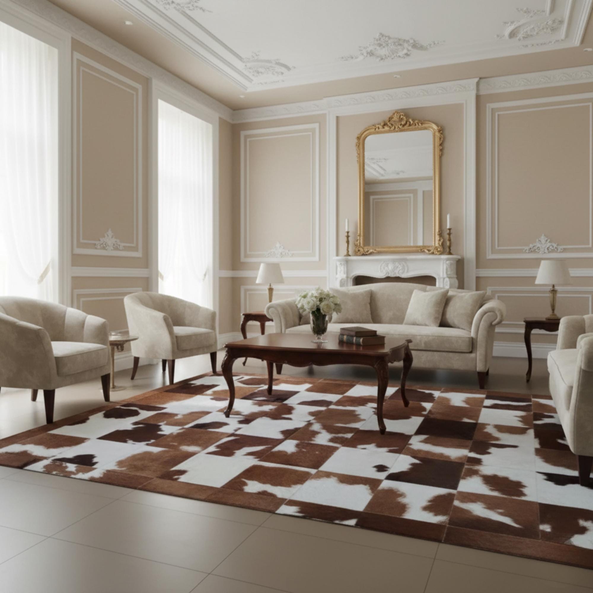 Kahverengi, bej ve beyaz tonların dengeli dağılımıyla tasarlanan dana derisi patchwork halı, geniş parçalı yapısıyla sade ve güçlü bir görünüm sunar. Gerçek dana derisinden üretilen bu halı, doğal dokusu ve yumuşak renk geçişleriyle öne çıkar.