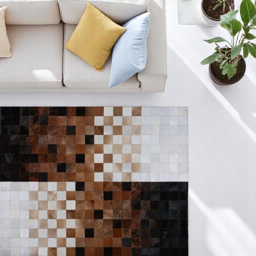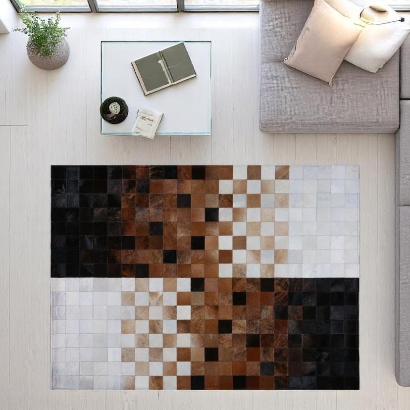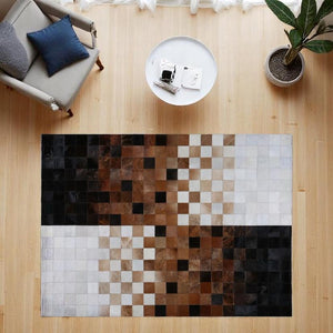 Kahverengi Beyaz Dana Derisi Patchwork Halı – El Yapımı Hakiki Deri Lüks Dekoratif Halı