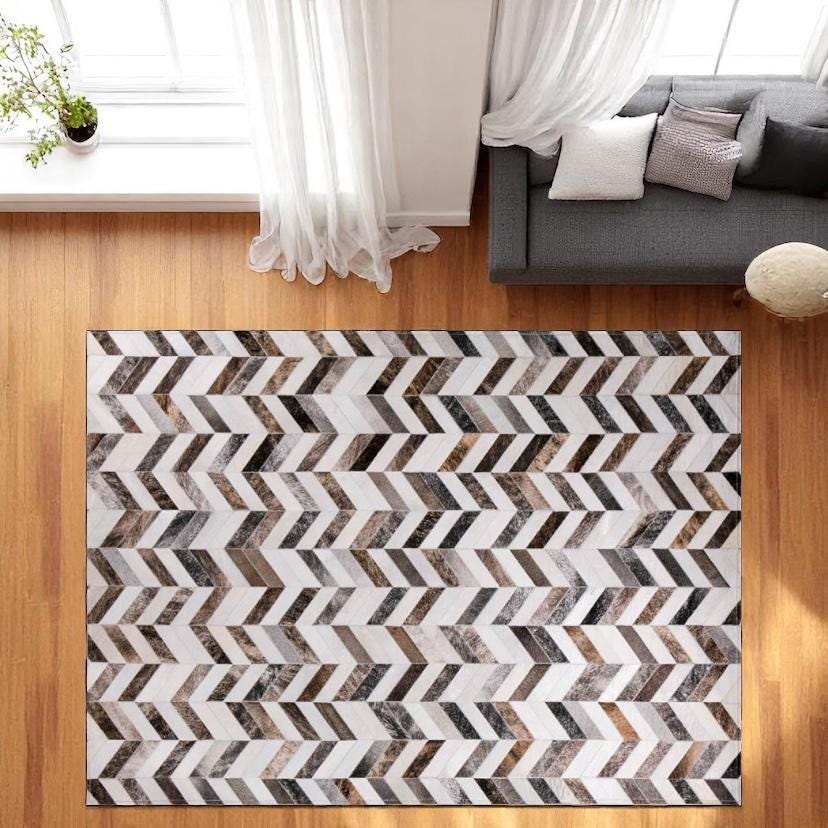 Kahverengi & doğal tonlara sahip bu dana derisi halı, doğal dokusu ve şık görünümüyle dikkat çeker.