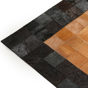 Siyah & kahverengi & bej tonlara sahip bu dana derisi halı, doğal dokusu ve şık görünümüyle dikkat çeker.