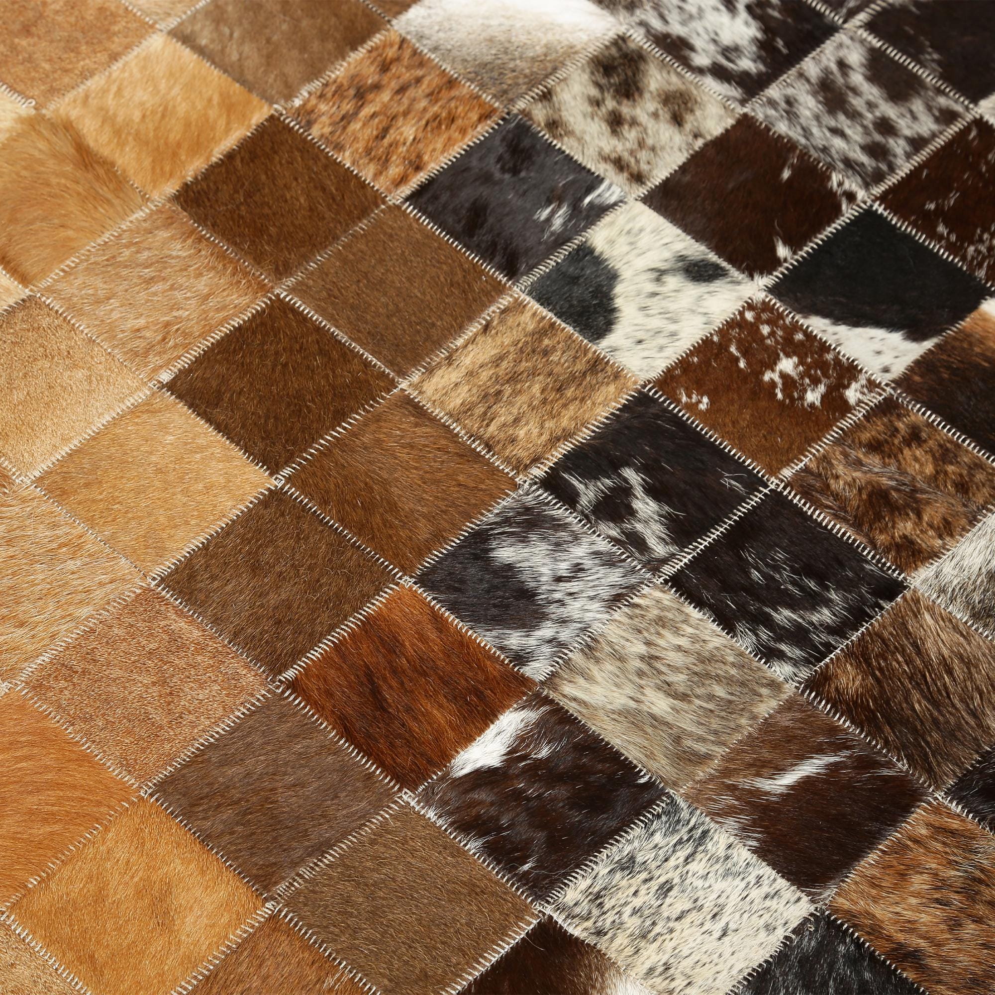 Kahverengi Doğal Dana Derisi Patchwork Halı – El Dokuma Gerçek Deri Kaymaz Salon Halısı