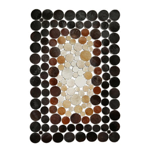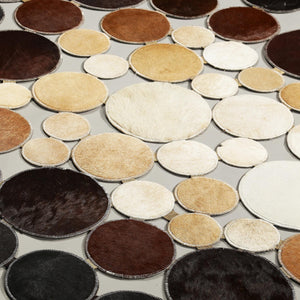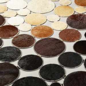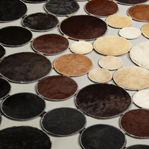 Yuvarlak formda tasarlanan bu kahverengi puantiyeli halı, doğal dana derisinin estetiğini taşır. El işçiliğidir.