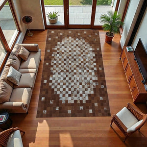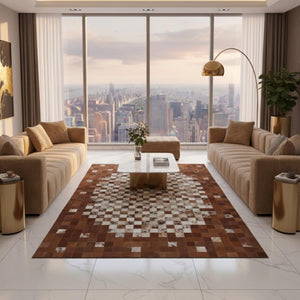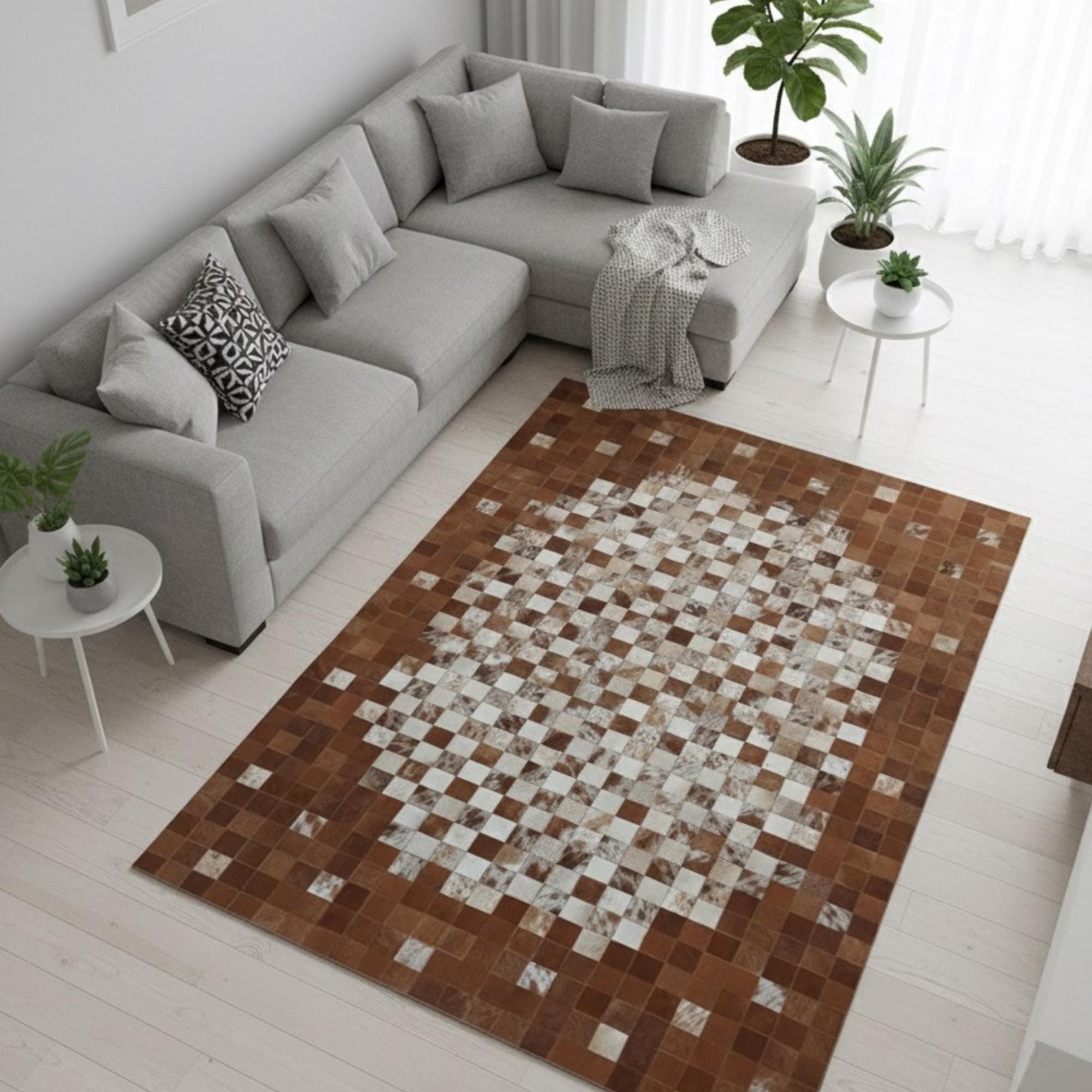 Kahverengi tonların merkezde yoğunlaştığı ve çevresinde bej ile koyu kahverengi geçişlerin yer aldığı dana derisi patchwork halı, katmanlı yapısıyla güçlü ve dengeli bir zemin etkisi sunar. Gerçek dana derisinden üretilen bu halı, doğal renk dağılımı sayesinde mekâna derinlik ve sıcaklık katar.