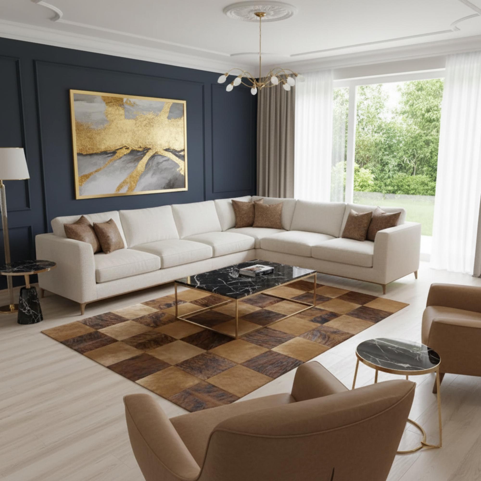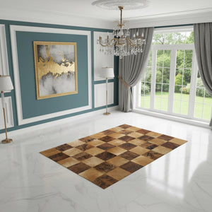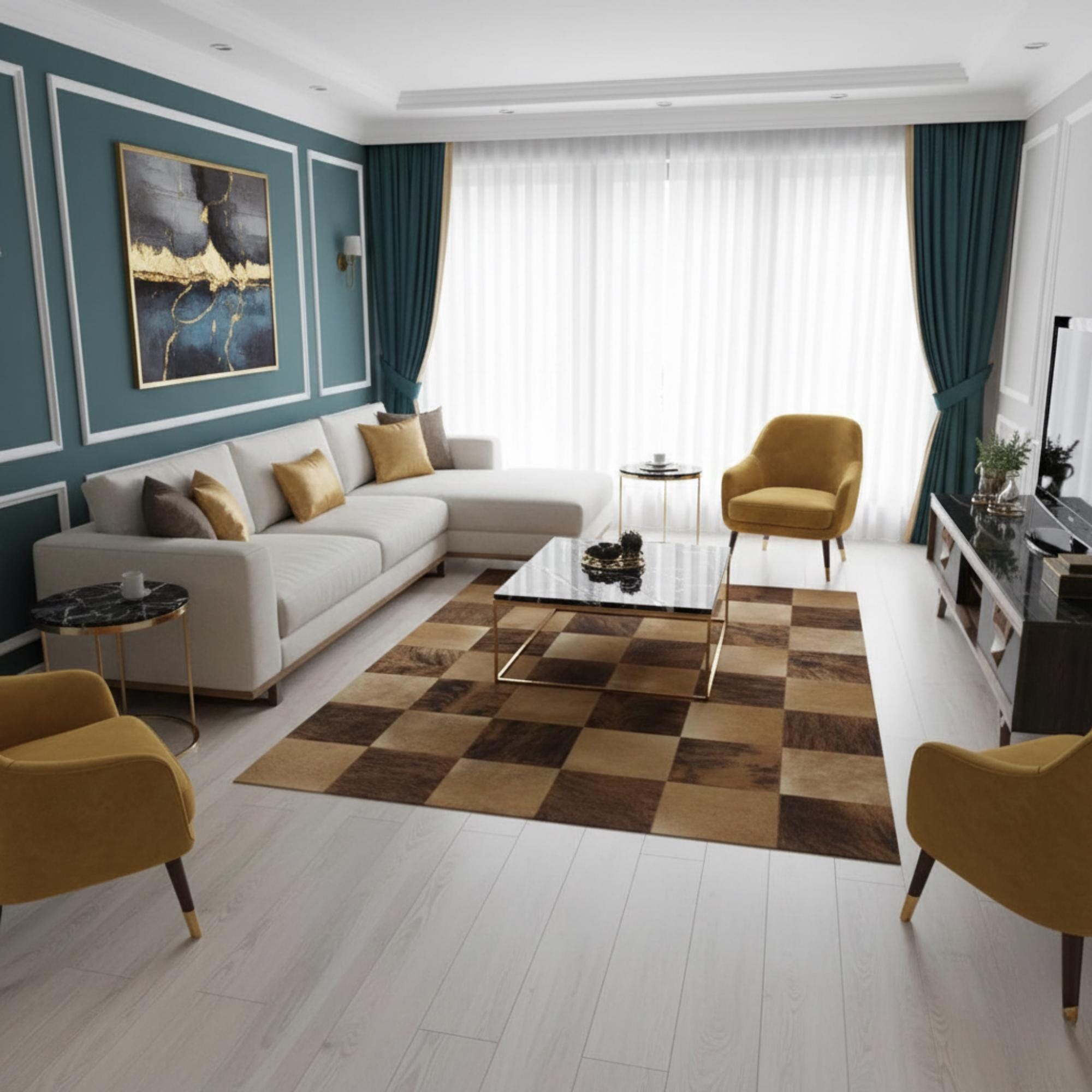 Açık ve koyu kahverengi tonların doğal uyumuyla tasarlanan dana derisi patchwork halı, düzenli kare formu sayesinde dengeli ve sade bir görünüm sunar. Gerçek dana derisinden üretilen bu halı, doğal dokusu ve sıcak renk paletiyle mekâna bütünlük kazandırır.