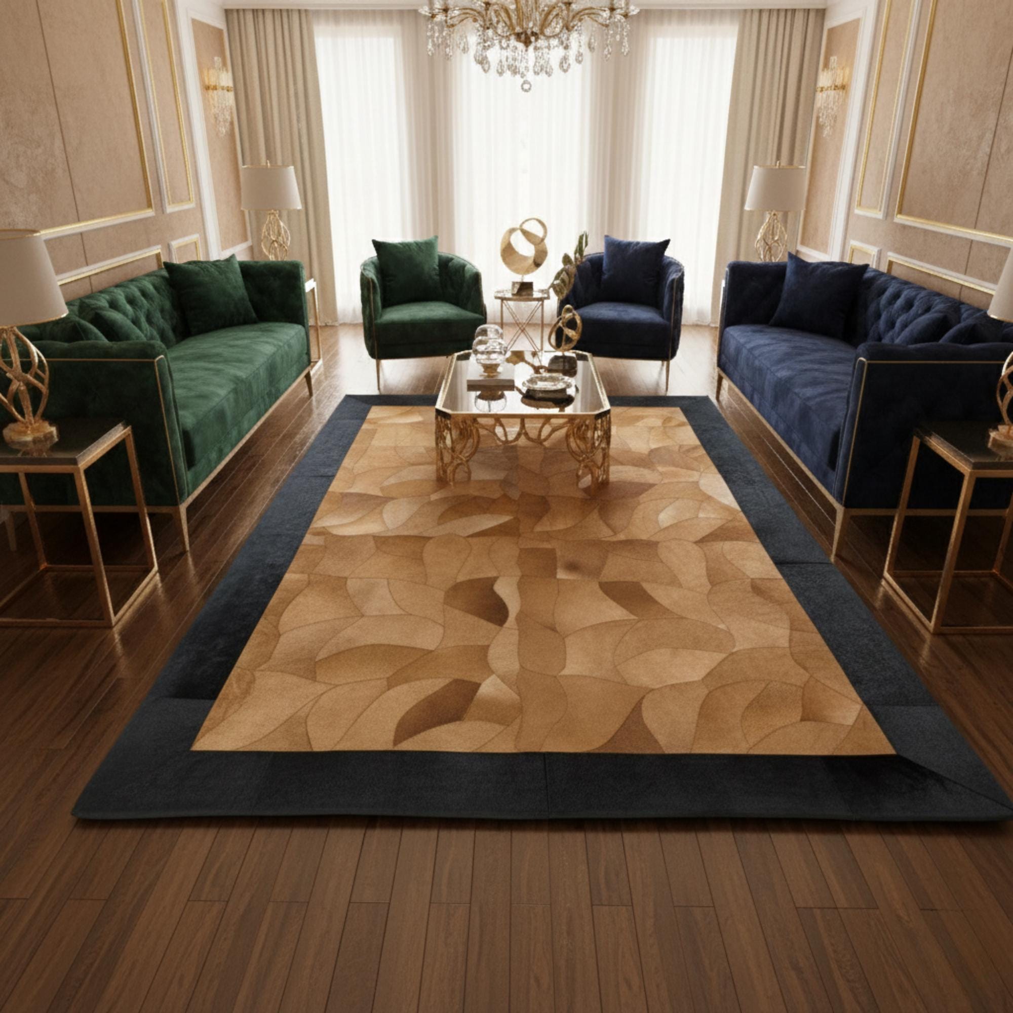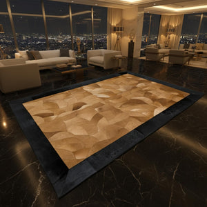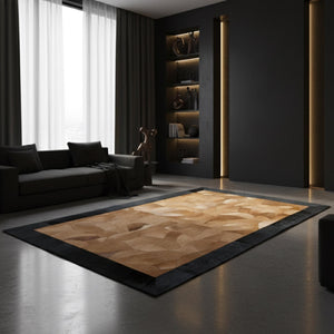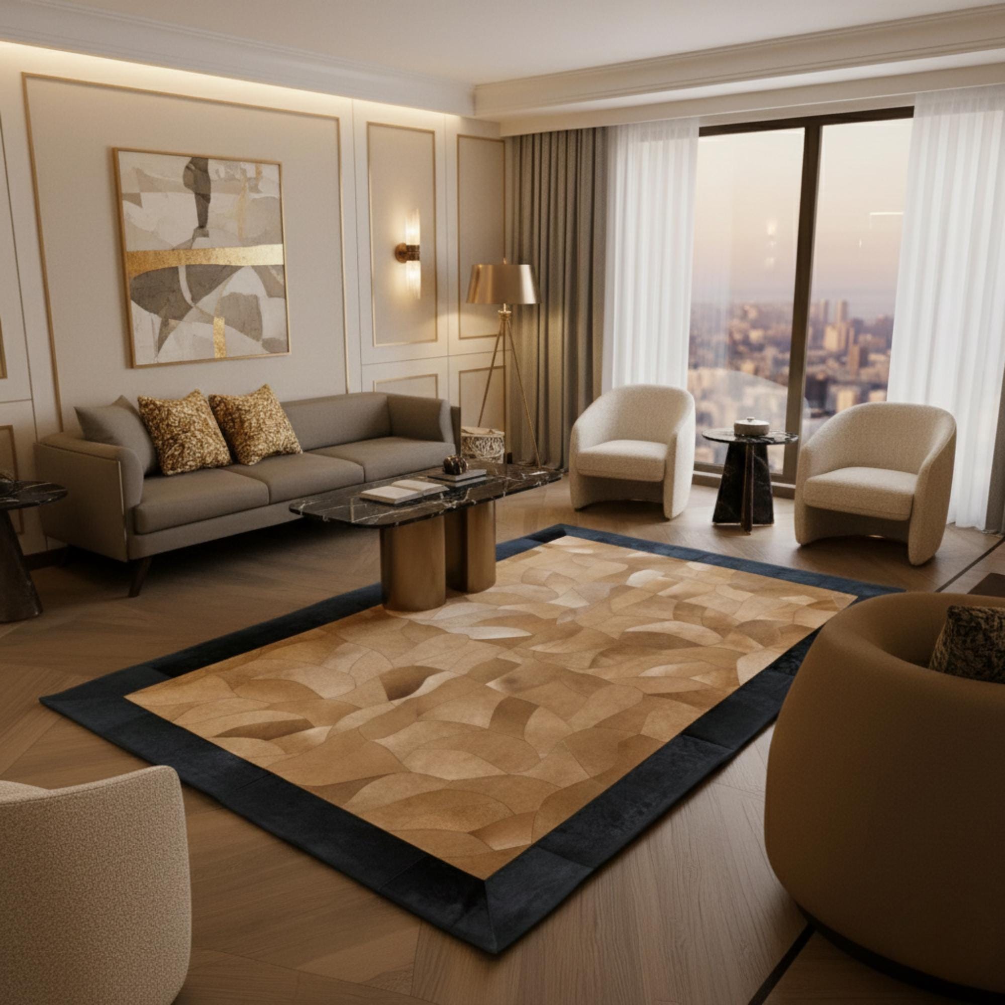 Merkezde açık kahverengi, taba ve doğal tonların yumuşak geçişiyle tasarlanan dana derisi patchwork halı, çevresindeki koyu siyah çerçevesiyle güçlü ve net bir kontrast oluşturur. Gerçek dana derisinden üretilen bu halı, doğal dokusu ve sade yüzeyiyle dengeli bir görünüm sunar.