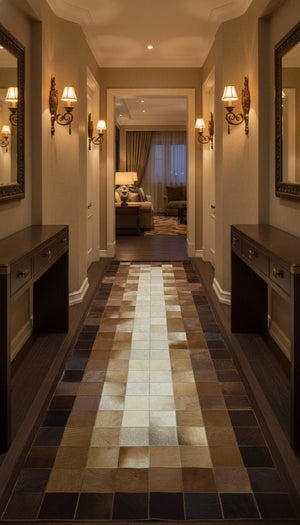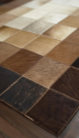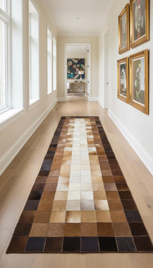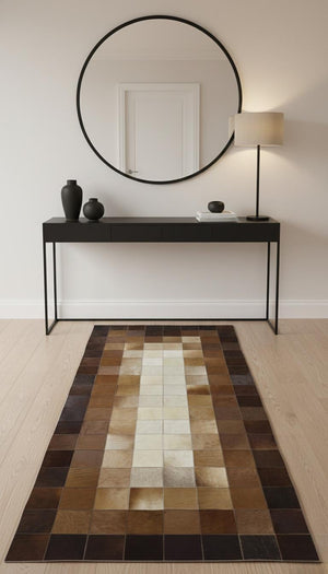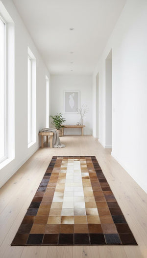 Merkezde açık bej ve krem tonların dengeli geçişiyle tasarlanan dana derisi patchwork runner halı, çevresindeki kahverengi tonlarla net ve düzenli bir çerçeve oluşturur. Gerçek dana derisinden üretilen bu halı, doğal dokusu ve uzun formuyla öne çıkar.