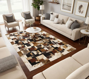 Kahverengi, Siyah ve Bej Tonlu Dana Derisi Patchwork Halı