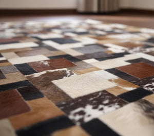 Kahverengi, siyah, bej ve beyaz tonların dengeli dağılımıyla tasarlanan dana derisi patchwork halı, zengin desen yapısıyla dikkat çeker. Gerçek dana derisinden üretilen bu halı, doğal dokusu ve çok tonlu yüzeyiyle güçlü bir görünüm sunar.