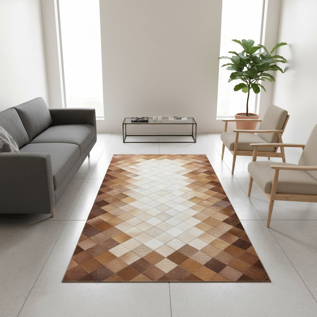 Doğal dana derisi kullanıldığı için her halıda renk, desen ve doku farklılıkları görülebilir. Bu durum ürünün özgün ve doğal karakterini yansıtır.