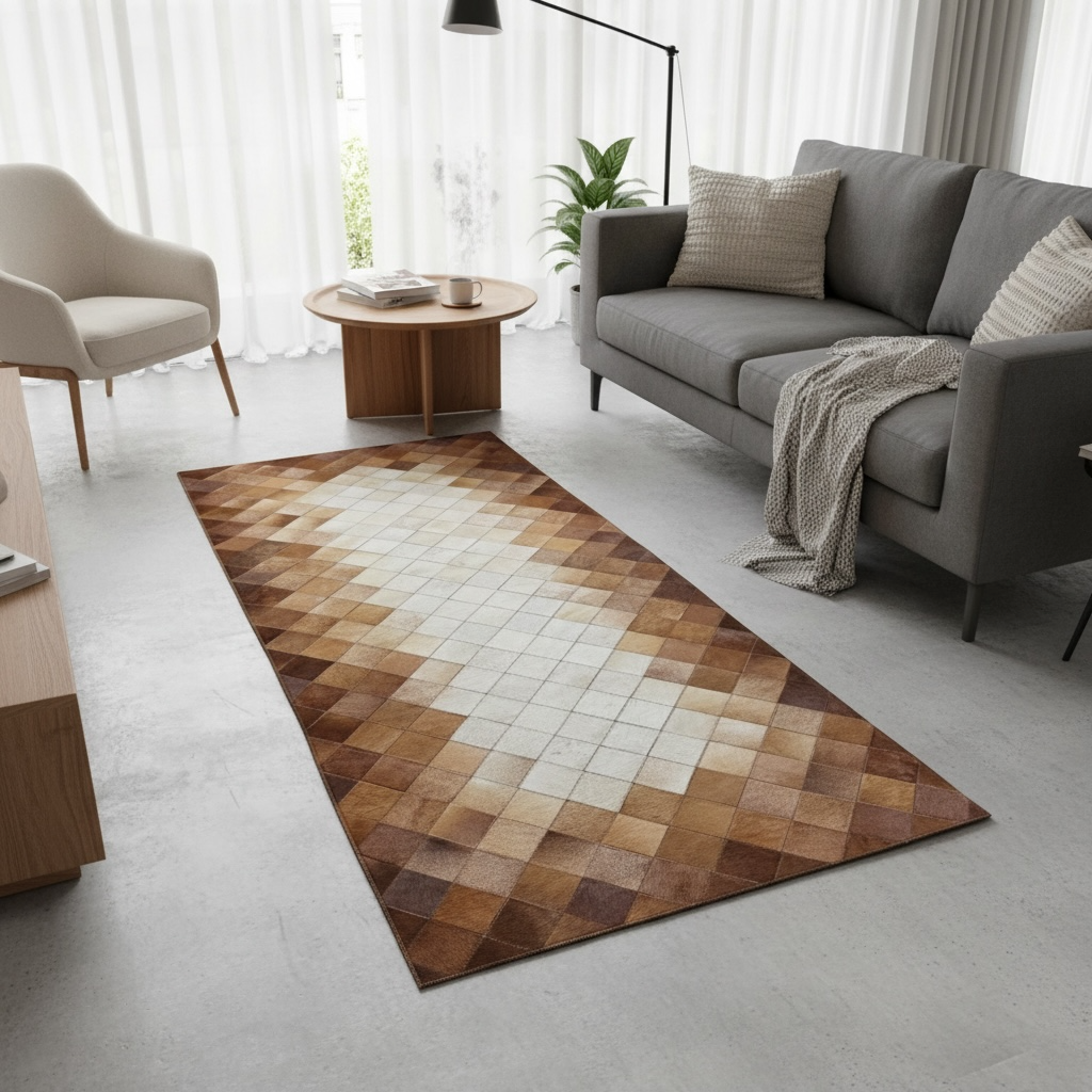 Merkez kısmında açık tonların yoğunlaştığı ve kenarlara doğru kahverengi geçişlerin yer aldığı dana derisi patchwork runner halı, uzun formuyla antre ve koridor alanlarında güçlü bir zemin etkisi sunar. Gerçek dana derisinden üretilen bu halı, doğal renk dağılımı sayesinde mekâna derinlik ve sıcaklık kazandırır.