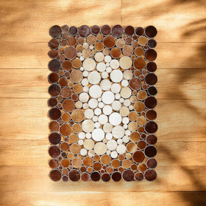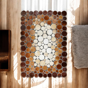 Yuvarlak formlu, kahve ve krem tonlarındaki puantiye desenli bu halı, yaşam alanlarına hareket katar.