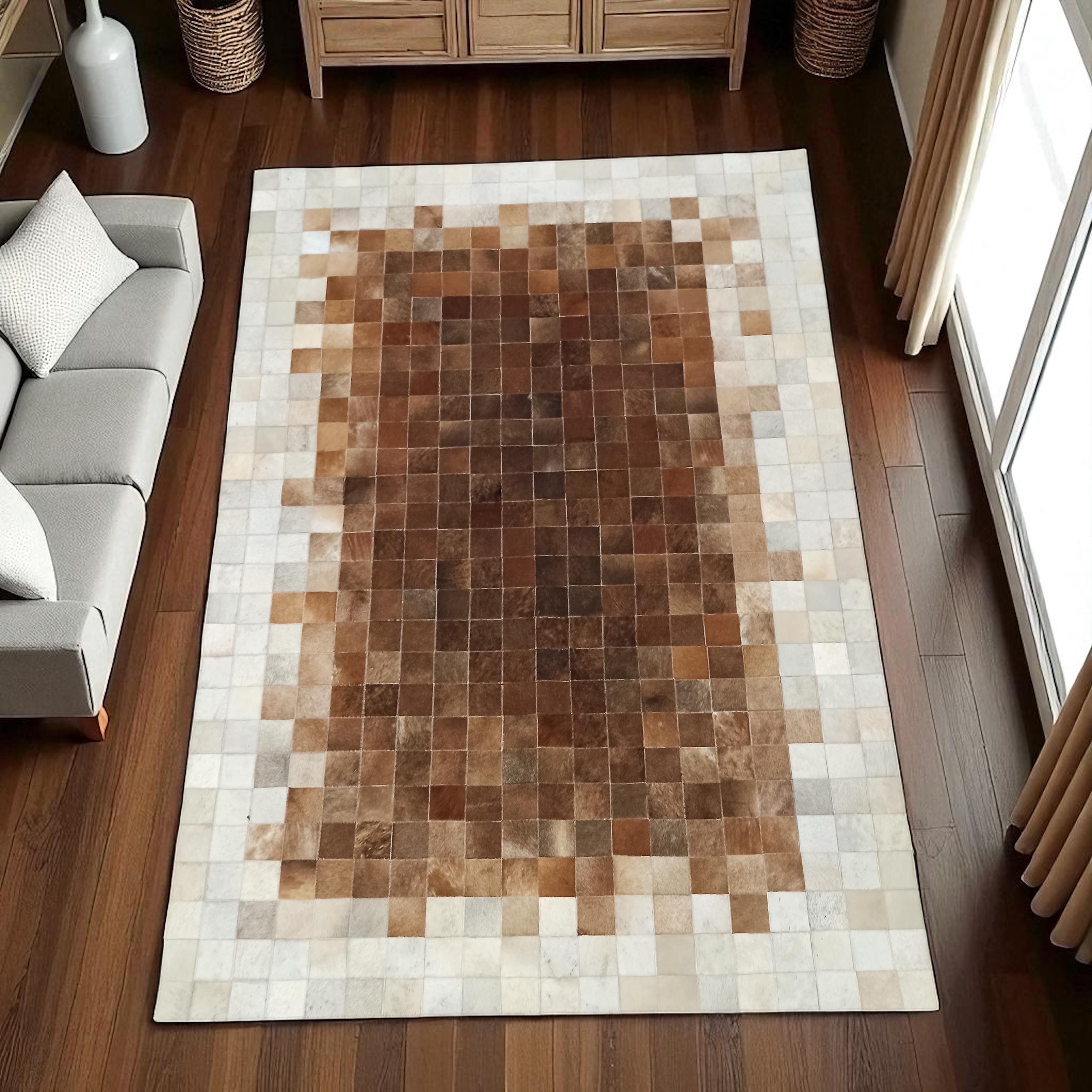 Doğal Dana Derisi Patchwork Halı – El Yapımı Kahverengi Modern Ortam Halısı