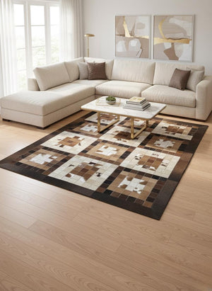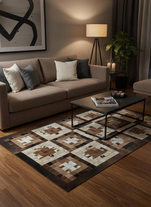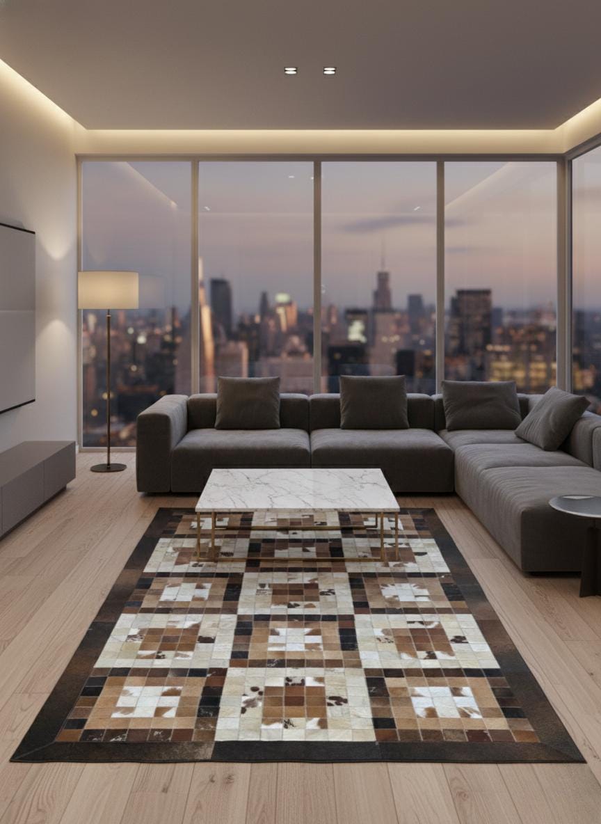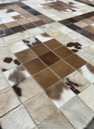 Kahverengi, bej, siyah ve açık doğal tonların dengeli dağılımıyla hazırlanan dana derisi patchwork halı, kare desenli yüzeyiyle düzenli ve modern bir görünüm sunar. Gerçek dana derisinden üretilen bu halı, doğal dokusu ve çok tonlu yapısıyla öne çıkar.
