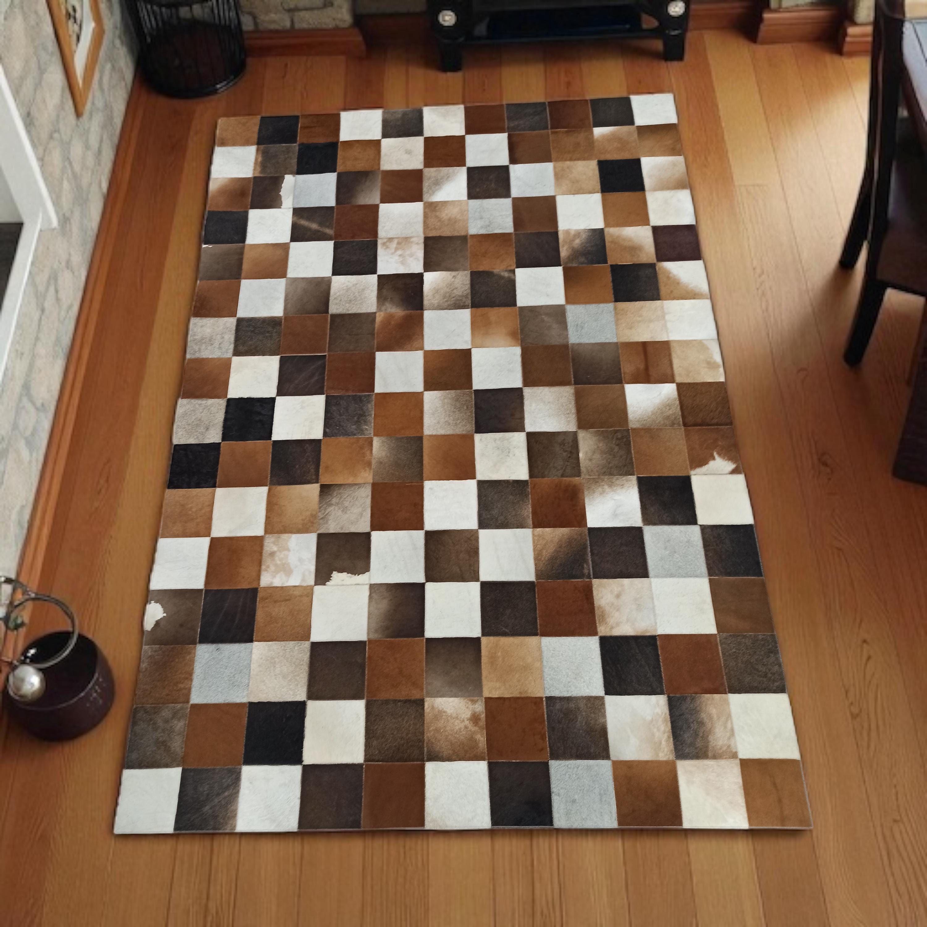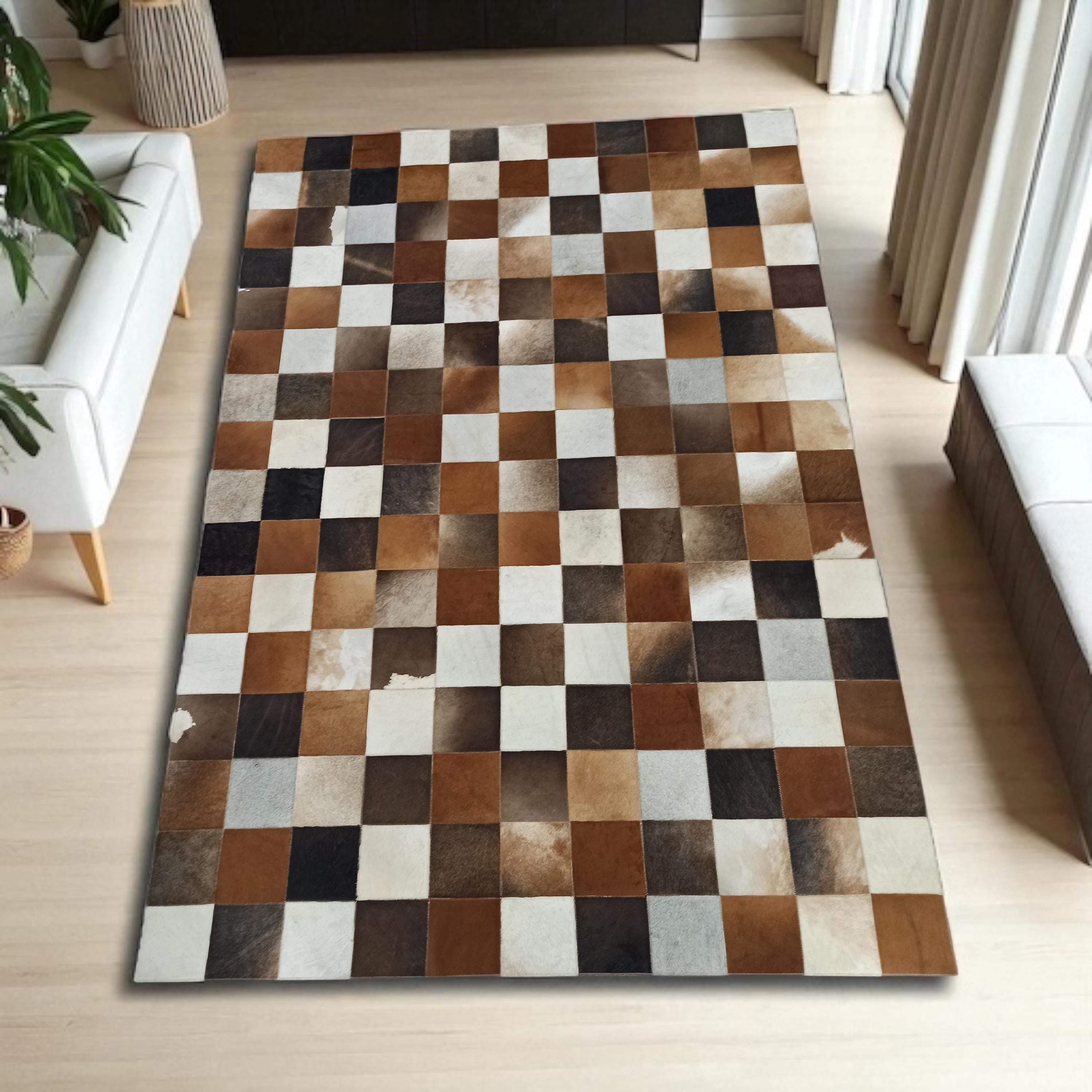 Kahverengi Beyaz Dana Derisi Patchwork Halı – El Yapımı Doğal Şık Salon Halısı