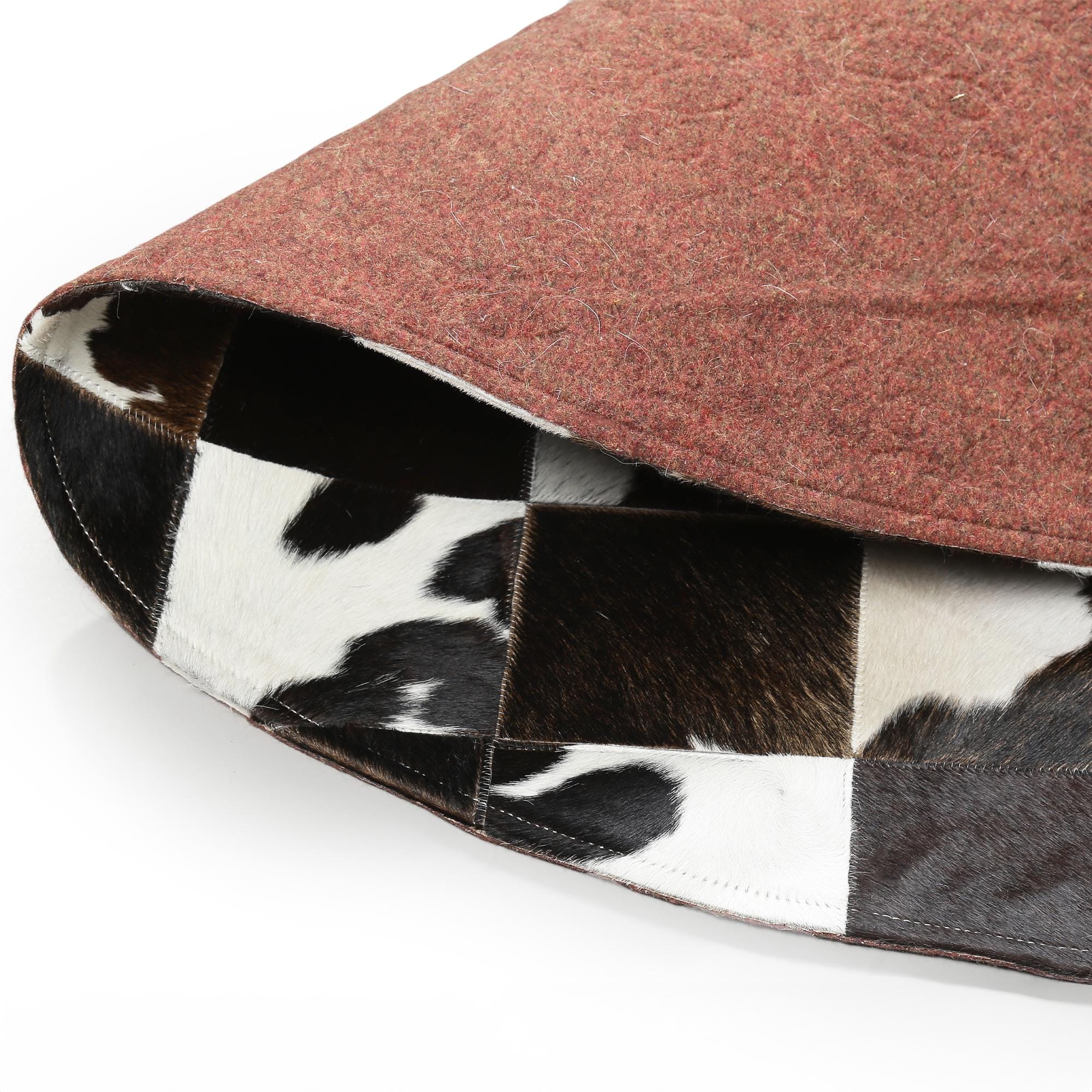 Bu yuvarlak dana derisi halı, el işçiliğiyle hazırlanmış olup doğal yapısıyla dikkat çeker.