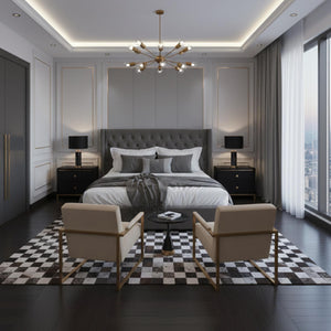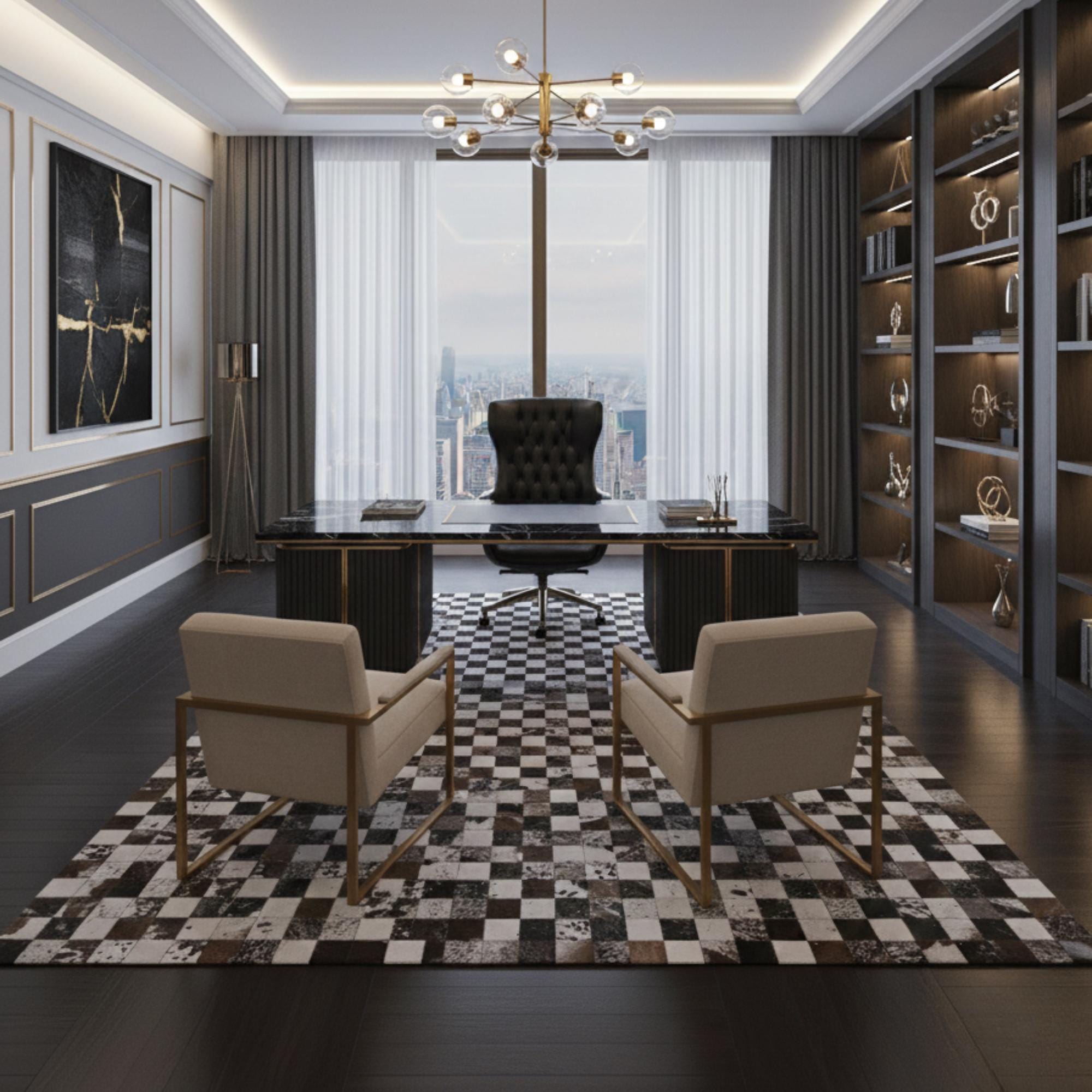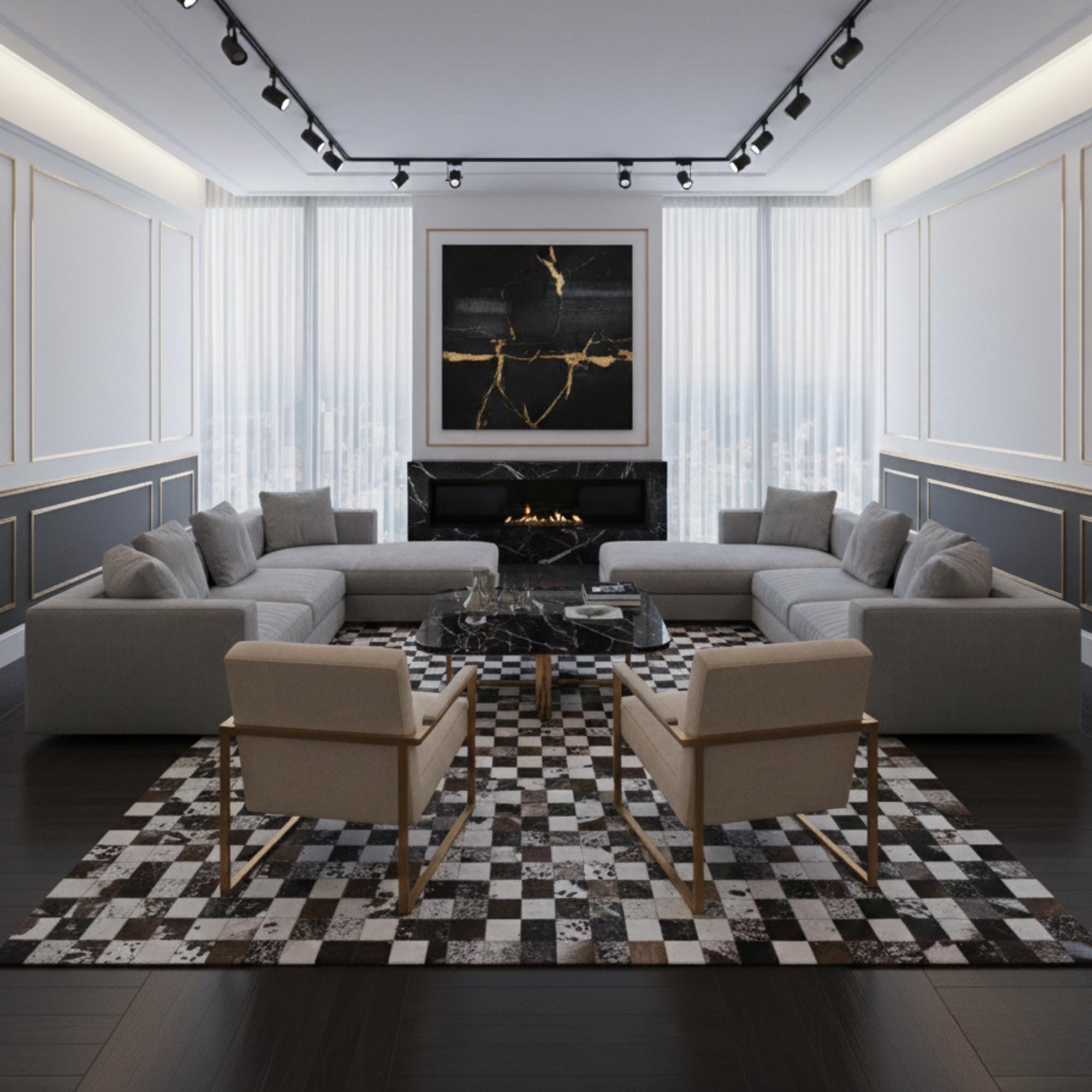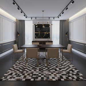Siyah ve beyaz tonların dengeli kontrastıyla tasarlanan dana derisi patchwork halı, düzenli kare desen yapısıyla modern ve net bir zemin etkisi sunar. Gerçek dana derisinden üretilen bu halı, sade renk paleti sayesinde farklı dekorasyon stilleriyle kolayca uyum sağlar.