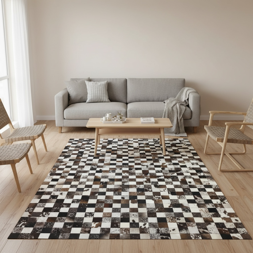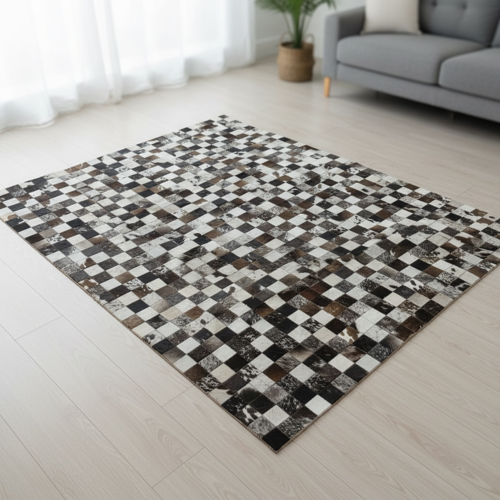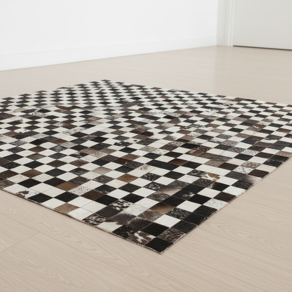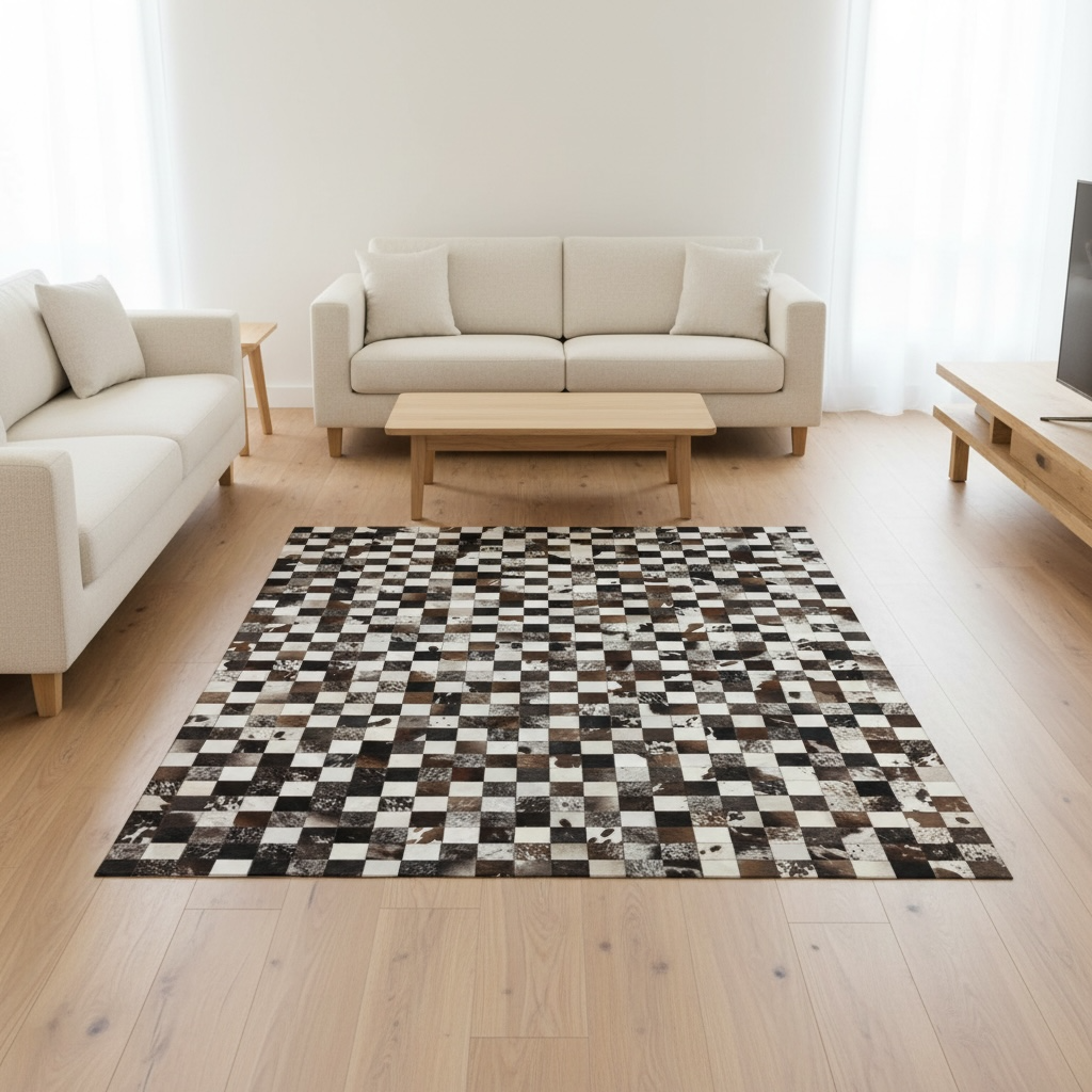 Siyah ve beyaz tonların dengeli kontrastıyla tasarlanan dana derisi patchwork halı, düzenli kare desen yapısıyla modern ve net bir zemin etkisi sunar. Gerçek dana derisinden üretilen bu halı, sade renk paleti sayesinde farklı dekorasyon stilleriyle kolayca uyum sağlar.