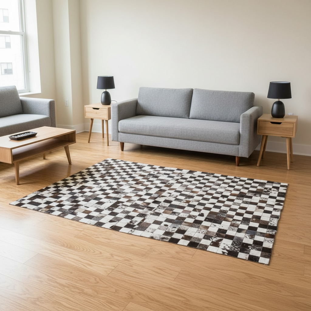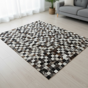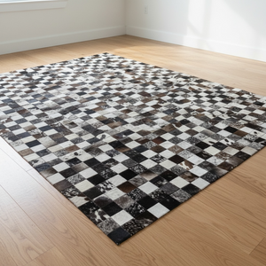 Siyah, Kahverengi ve Beyaz Tonlu Dana Derisi Patchwork Halı