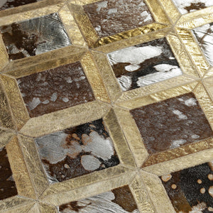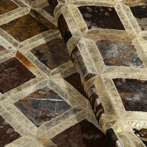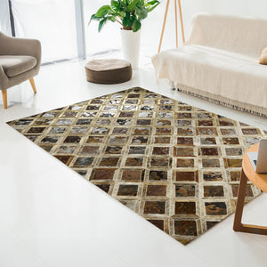 Altın Kahverengi Tonlu Dana Derisi Patchwork Halı – El Dokuma Hakiki Deri Şık Salon Halısı