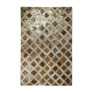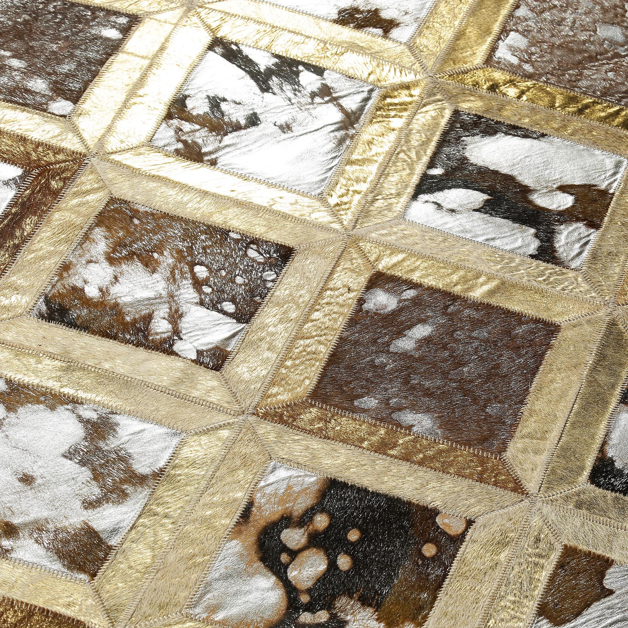 Kahverengi & altın tonlara sahip bu dana derisi halı, doğal dokusu ve şık görünümüyle dikkat çeker.