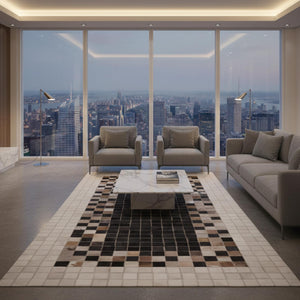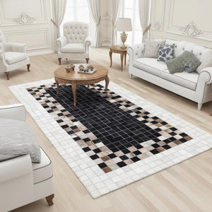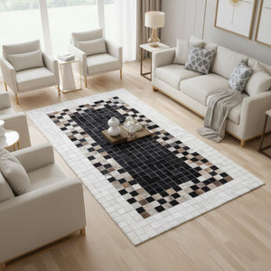 Siyah ve Krem Tonlu Dana Derisi Patchwork Halı – El Yapımı Doğal Deri Dekoratif Halı