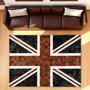 Ana Sayfa İngiltere Bayrak Baskılı Dana Derisi Patchwork Halı – El Yapımı Hakiki Deri Dekoratif Salon Halısı