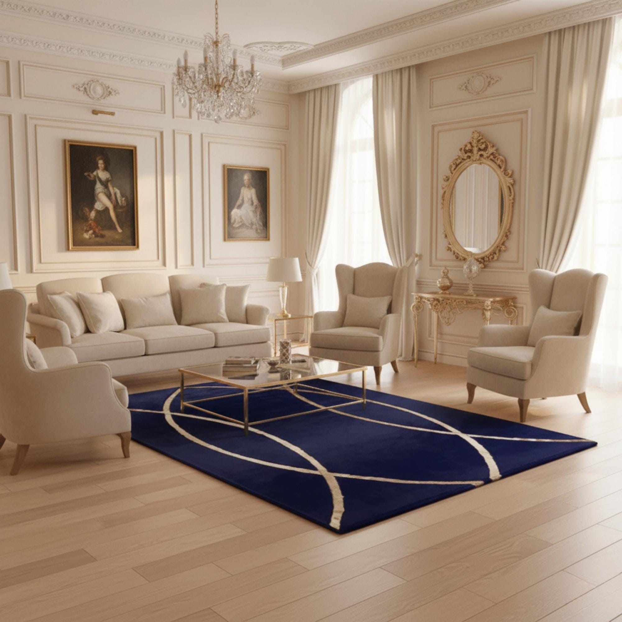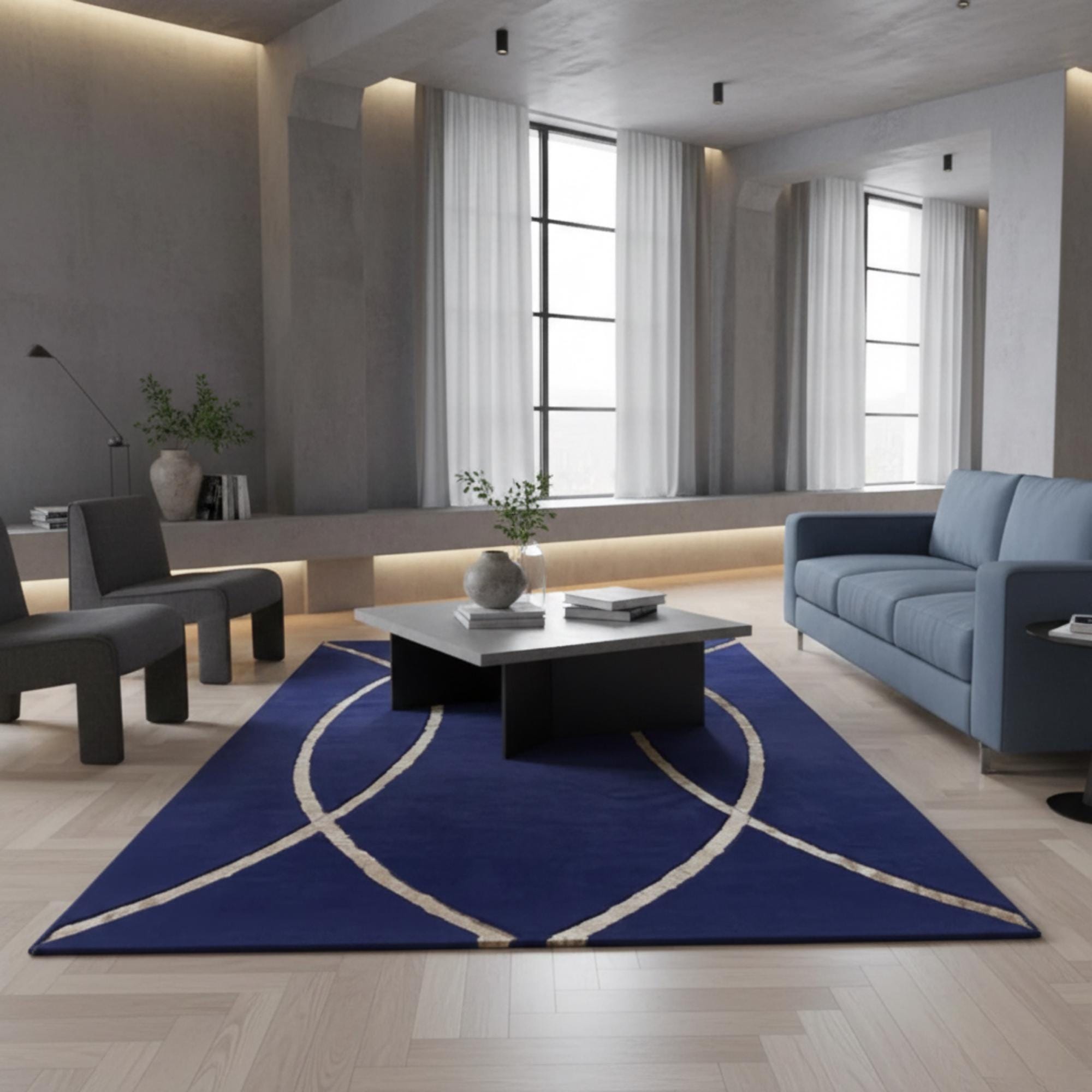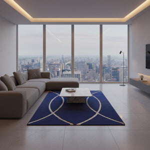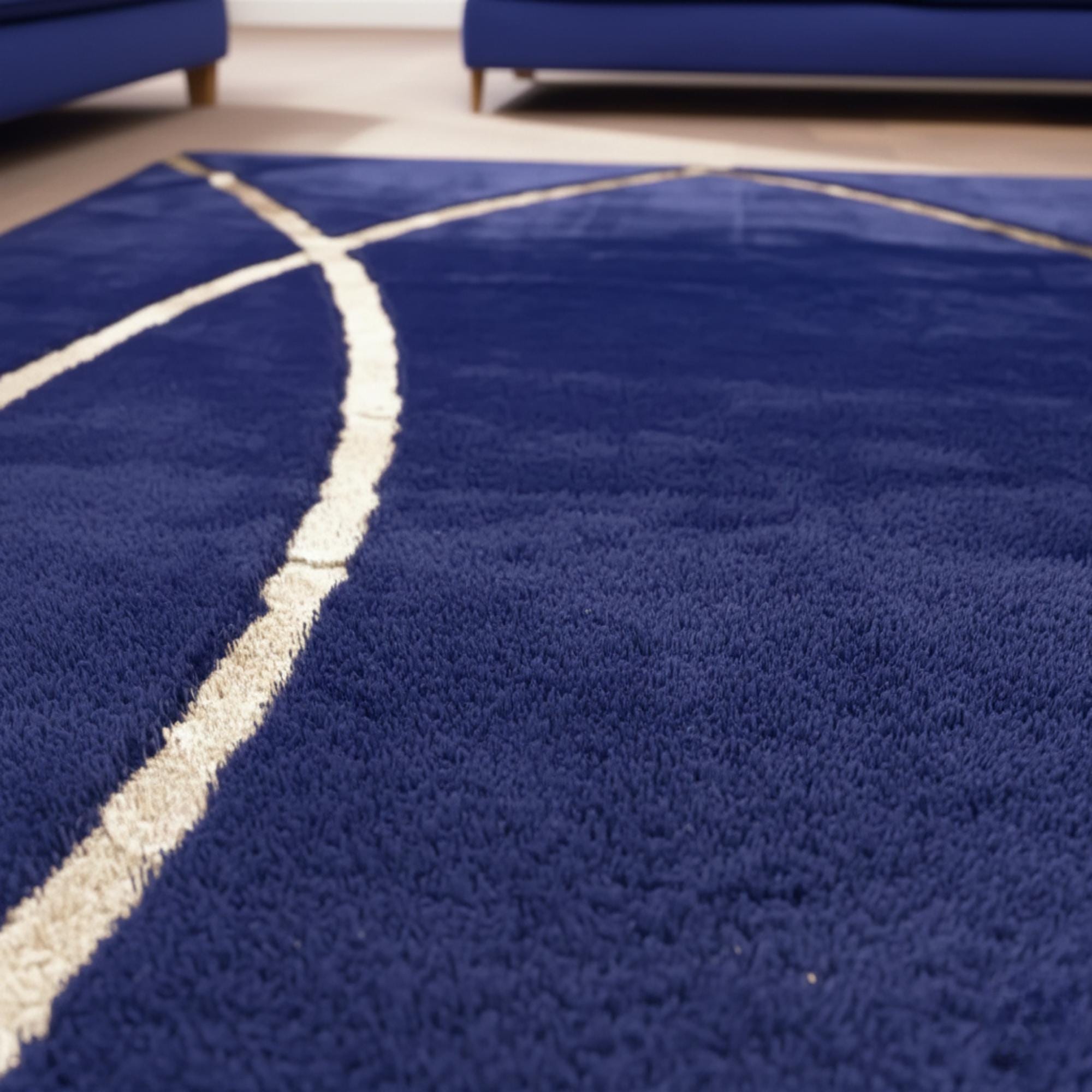 Lacivert zemin üzerine altın kavisli çizgi desenleriyle tasarlanan bu peluş halı, derin renk tonu ve akıcı formuyla mekâna sofistike ve modern bir görünüm kazandırır. Kavisli çizgiler yüzeyde dengeli bir hareket oluştururken, koyu zemin tasarımı net ve güçlü bir odak noktası haline getirir.
